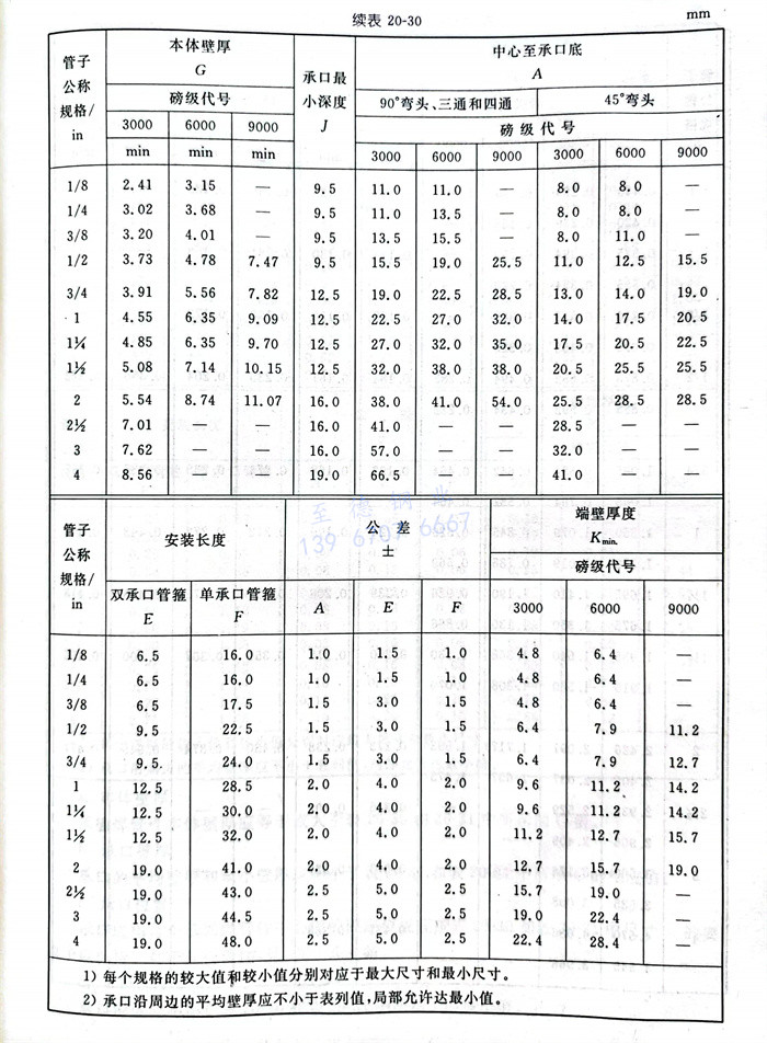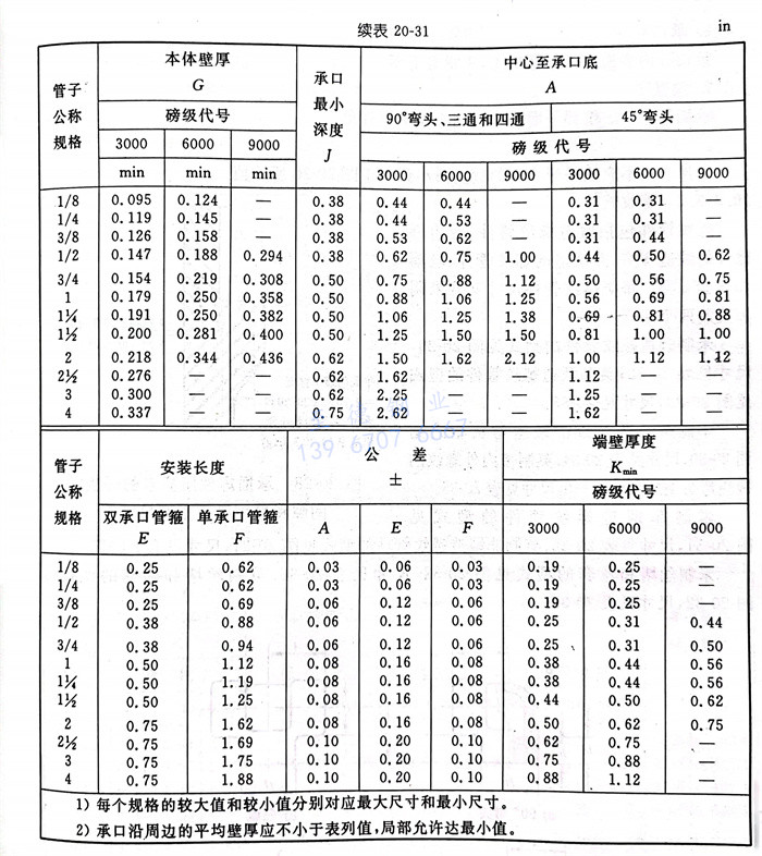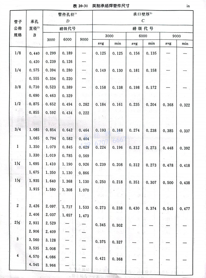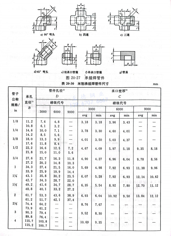 承(cheng)插焊(han)管件本(ben)體壁厚(hou)應(ying)等(deng)于(yu)或大于(yu)表20-30和20-31中所示(shi)的G值。