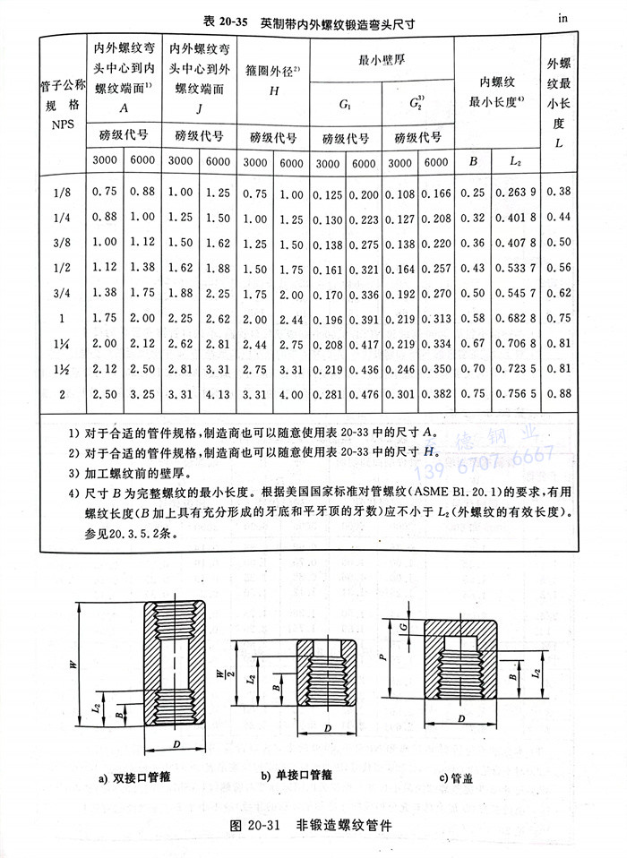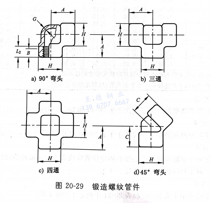 米制鍛造螺紋(wen)管(guan)件(jian)的(de)型式(shi)見(jian)圖20-29,尺(chi)寸見(jian)表20-32;英(ying)制鍛造螺紋(wen)管(guan)件(jian)的(de)型式(shi)見(jian)圖20-29,尺(chi)寸見(jian)20-33。