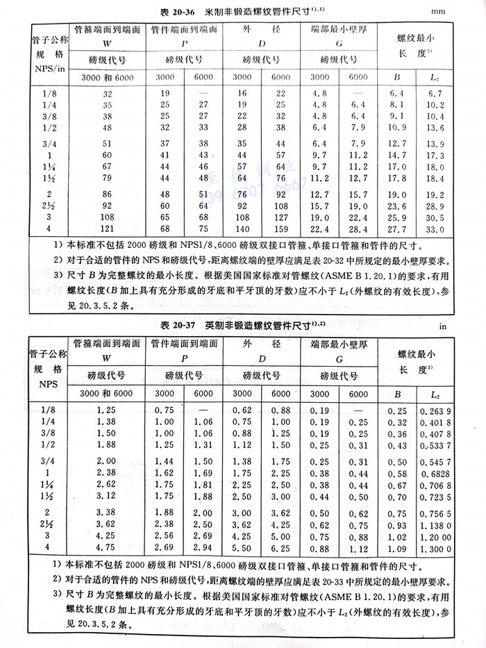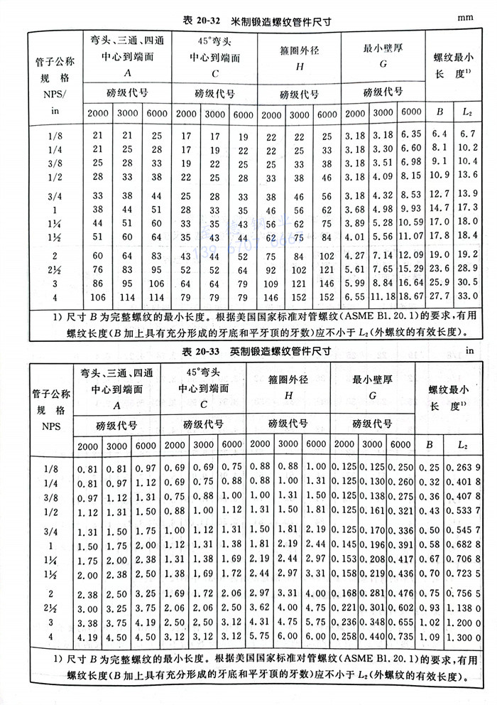 由于(yu)ASME B36.10M既不包(bao)括Sch160,也不包(bao)括NPS1/8、NPS1/4和NPS3/8雙倍加厚管的(de)壁(bi)厚,所以表20-28中的(de)數值(zhi)可用于(yu)作為確(que)定等級時(shi)管子的(de)公稱壁(bi)厚。