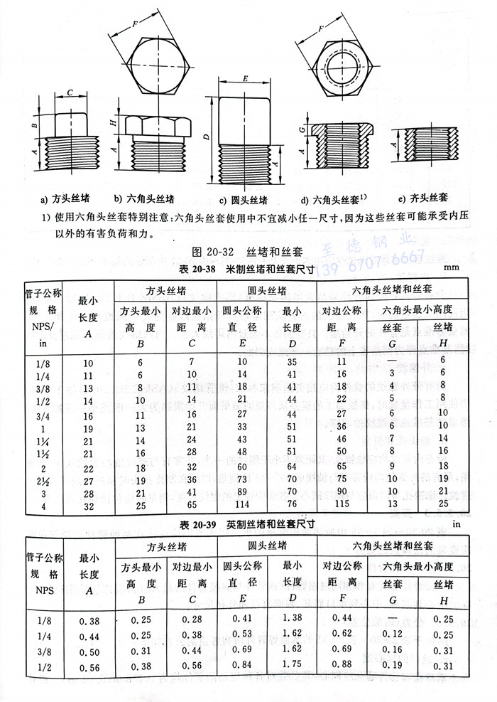 米制絲(si)堵和絲(si)套的型式見(jian)(jian)圖20-32,尺寸見(jian)(jian)表20-38;英制絲(si)堵和絲(si)套的型式見(jian)(jian)圖20-32,尺寸見(jian)(jian)表20-39。