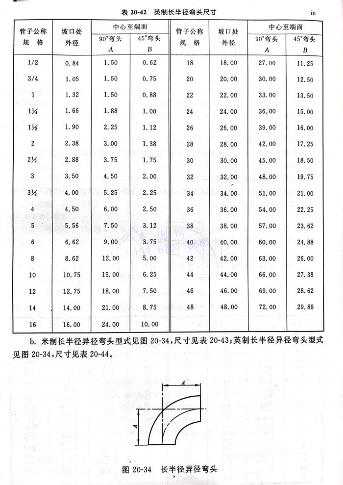 a. 米制尺(chi)(chi)寸(cun)的長半徑彎頭型式見(jian)圖20-33,尺(chi)(chi)寸(cun)見(jian)表(biao)20-41;英(ying)制尺(chi)(chi)寸(cun)的長半徑彎頭型式見(jian)圖20-33,尺(chi)(chi)寸(cun)見(jian)表(biao)20-42。