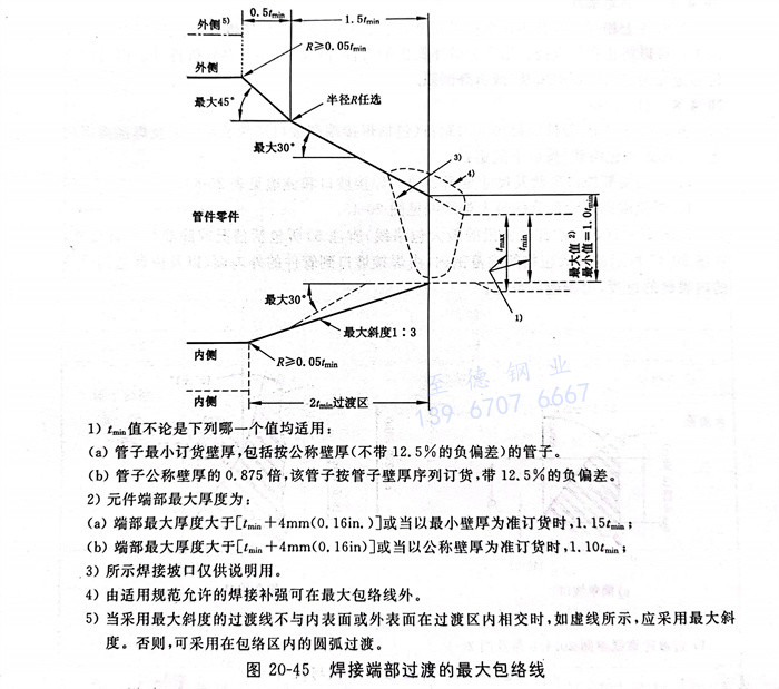 除圖(tu)20-45(焊(han)接端部過(guo)渡段的最大包(bao)絡線)腳注5)所包(bao)括(kuo)情況或(huo)除非特殊訂貨外(wai),在(zai)圖(tu)20-45所示(shi)的最大包(bao)絡線的范圍(wei)內(nei),由焊(han)接坡口到(dao)(dao)管件的外(wai)表(biao)面、以及由鈍邊到(dao)(dao)管件的內(nei)表(biao)面的過(guo)渡,由制造廠自(zi)定。