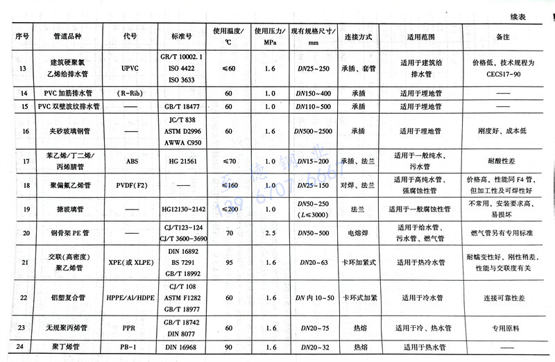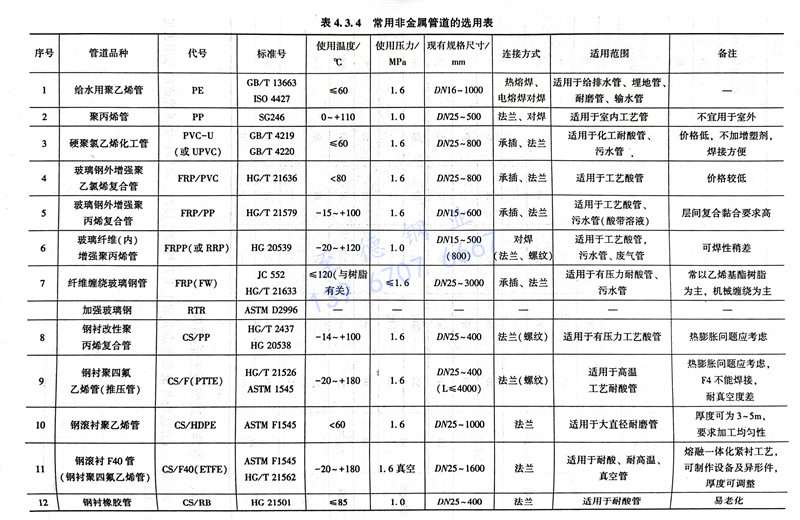 非(fei)金屬(shu)材料的選(xuan)用(yong)須重點(dian)考慮其加工工藝(yi)性(xing)和(he)連接性(xing),常用(yong)非(fei)金屬(shu)管(guan)道的選(xuan)用(yong)表見表4.3.4。