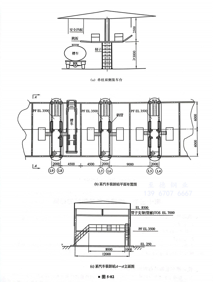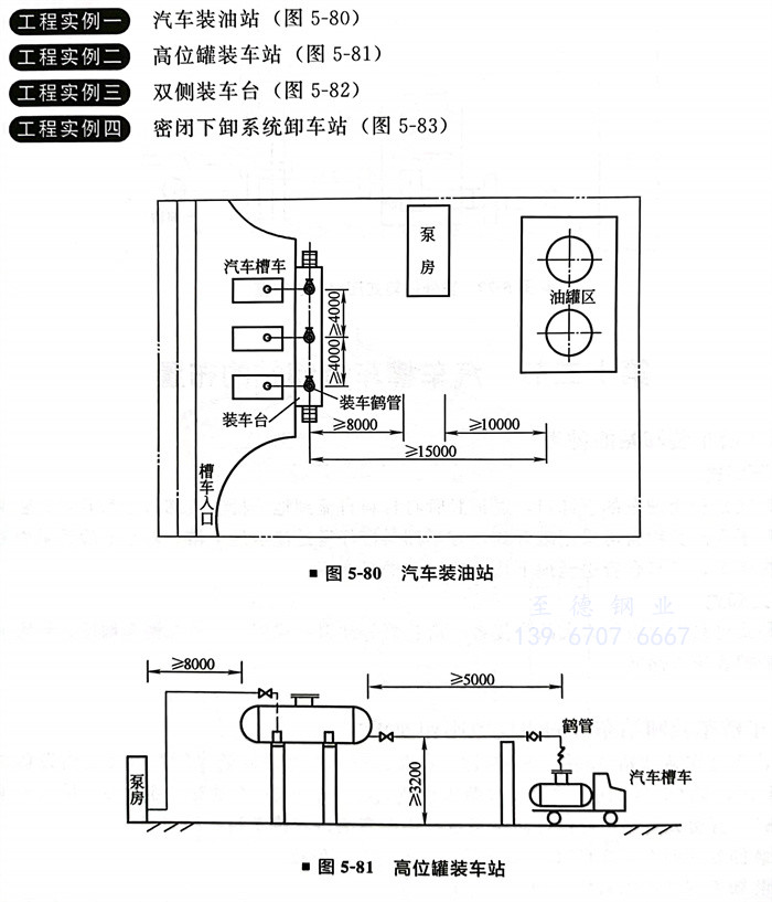①. 汽車(che)槽(cao)車(che)裝(zhuang)卸站(zhan)與(yu)儲罐、建筑物、道路、廠內鐵(tie)路之(zhi)間(jian)(jian)防(fang)火(huo)間(jian)(jian)距以及站(zhan)內設(she)(she)備之(zhi)間(jian)(jian)的防(fang)火(huo)間(jian)(jian)距,見GB50016《建筑設(she)(she)計防(fang)火(huo)規范(fan)》、GB 50160《石油化(hua)工企業設(she)(she)計防(fang)火(huo)標(biao)準》、GB 50183《石油天然氣工程設(she)(she)計防(fang)火(huo)規范(fan)》中的有關汽車(che)槽(cao)車(che)裝(zhuang)卸站(zhan)的規定(ding)。
