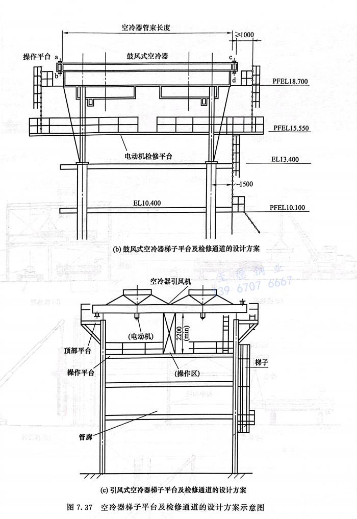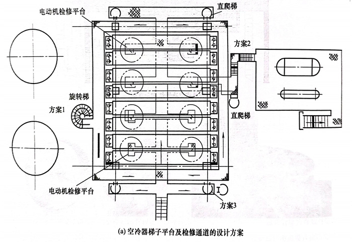對于(yu)布置在不同位置、不同形(xing)式的(de)(de)空(kong)(kong)冷(leng)(leng)器(qi)應(ying)結合以上三種方案,在滿足(zu)操作(zuo)、檢修、安全的(de)(de)要求(qiu)下,盡量(liang)設置經(jing)濟(ji)、簡(jian)單(dan)的(de)(de)梯子(zi)平臺。空(kong)(kong)冷(leng)(leng)器(qi)電(dian)動機(ji)(ji)(ji)檢修平臺要根據電(dian)動機(ji)(ji)(ji)本身的(de)(de)重量(liang)和尺寸確定平臺的(de)(de)大小。空(kong)(kong)冷(leng)(leng)器(qi)電(dian)動機(ji)(ji)(ji)檢修平臺的(de)(de)標高(gao)一般(ban)比電(dian)動機(ji)(ji)(ji)的(de)(de)底面(mian)標高(gao)低1500mm。