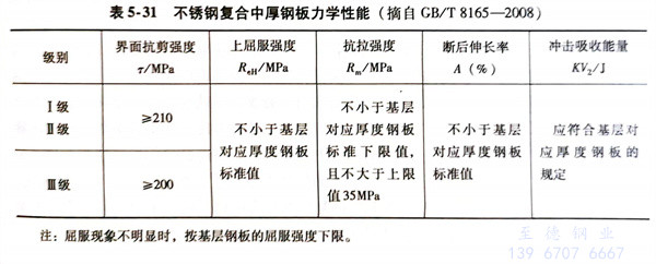 不銹鋼(gang)(gang)(gang)復(fu)(fu)合中厚鋼(gang)(gang)(gang)板(ban)的復(fu)(fu)層(ceng)和基層(ceng)的化學(xue)成(cheng)分(fen)應(ying)符合其各自牌號的化學(xue)成(cheng)分(fen)。復(fu)(fu)合中厚鋼(gang)(gang)(gang)板(ban)的力(li)學(xue)性(xing)能、界面抗剪強度、沖擊功和彎曲試驗應(ying)滿足表5-31和表5-32所列的各項要求(qiu)。