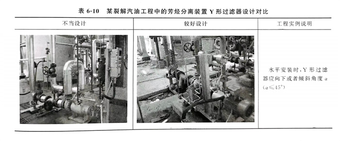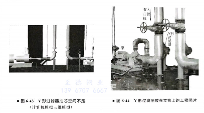 圖6-43所示(shi)某工程設計實例,Y形(xing)(xing)過(guo)(guo)(guo)濾(lv)器(qi)放(fang)置于(yu)水平(ping)管,由于(yu)設計失誤,造成Y形(xing)(xing)過(guo)(guo)(guo)濾(lv)器(qi)距離地面很近,其抽芯空間(jian)不足。圖6-44所示(shi)為該工程施(shi)工照片,把Y形(xing)(xing)過(guo)(guo)(guo)濾(lv)器(qi)放(fang)在立管上(shang),注(zhu)意(yi)避免使上(shang)面的(de)操作(zuo)閥門手輪中心標高超過(guo)(guo)(guo)1.8m而造成操作(zuo)上(shang)的(de)不方便。