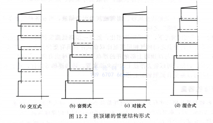 罐壁是主要受(shou)力(li)部件,壁板(ban)的各(ge)縱焊(han)縫(feng)采用對接(jie)焊(han),環(huan)焊(han)縫(feng)采用套筒式(shi)(shi)或(huo)對接(jie)式(shi)(shi),也(ye)有采用混合(he)式(shi)(shi)連接(jie),如(ru)圖12.2所示(shi)。拱(gong)頂(ding)罐的罐頂(ding)近(jin)似于球面,按(an)截面形(xing)狀有準球形(xing)拱(gong)頂(ding)和球形(xing)拱頂兩種,見圖12.3。拱頂油(you)(you)罐由于(yu)氣相空間大,油(you)(you)品(pin)蒸發損耗大,故不宜儲(chu)存輕質(zhi)油(you)(you)品(pin)和原油(you)(you),宜儲(chu)存低揮發性及重質(zhi)油(you)(you)品(pin)。