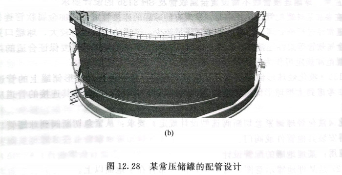 圖12.28(b)所示(shi)為(wei)罐側部有關消(xiao)防管線的配管設(she)計。這些消(xiao)防管線宜設(she)計成與罐壁(bi)平(ping)行的弧線形(xing),避免設(she)計成多角形(xing)。