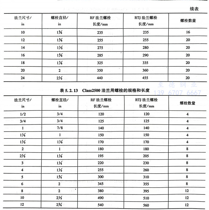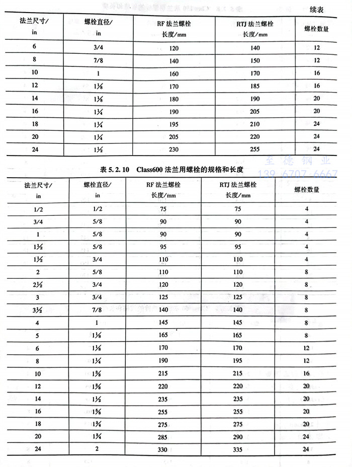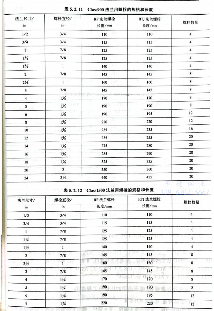 螺栓(shuan)長度的取(qu)值可從ASMEB16.5中(zhong)的推薦值來選(xuan)擇,但(dan)是,還(huan)需要考(kao)慮螺栓(shuan)自身的牙型、施工安裝位(wei)置(zhi)、連接件長度等因(yin)素(su)。RF、RTJ法蘭用螺栓(shuan)的規格和長度,Class150見表(biao)(biao)5.2.8,Class300見表(biao)(biao)5.2.9,Class600 見表(biao)(biao)5.2.10,Class900見表(biao)(biao)5.2.11,Class1500見表(biao)(biao)5.2.12,Class2500見表(biao)(biao)5.2.13。