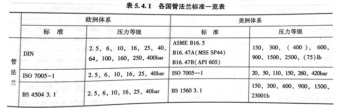 國際(包括國內)管法蘭標準主要有兩大體系,即歐洲體系(以DIN標準為代表)以及美洲體系[以美國ASME B16.5、ASME B16.47(A系列,B系列)標準為代表]。同一體系內,各國的管法蘭標準基本上是可以互相配用的(指連接尺寸和密封面尺寸),兩個不同體系的法蘭是不能互相配用的。表5.4.1所示為各國管法蘭標準一覽表。