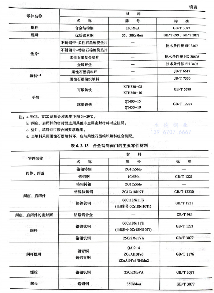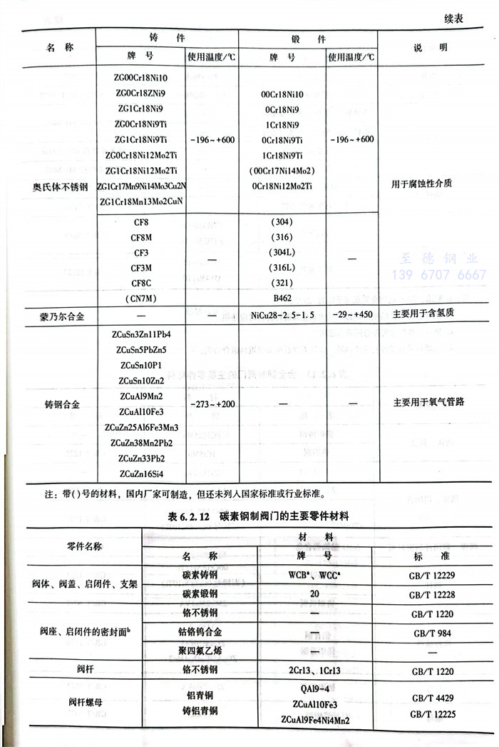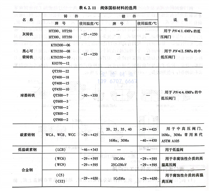 根據零件的結構尺寸、形狀決定采用鍛造或鑄造工藝。石油化工企業使用的通用閥(fa)門選用材料應執行行業標準SH/T 3064《石油化工鋼制通用閥門選用、檢驗及驗收》。國內標準閥門用材料的使用溫度范圍見表6.2.11。用于輸送介質溫度為-20~425℃碳素鋼制閥門的主要零件材料見表6.2.12。用于輸送介質溫度低于或等于550℃的合金鋼制閥門的主要零件材料見表6.2.13。用于輸送溫度低于或等于200℃的硝酸、醋酸的不銹鋼制閥門主要零件材料見表6.2.14。