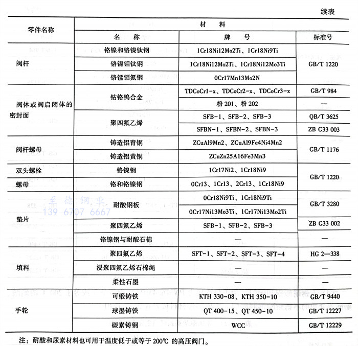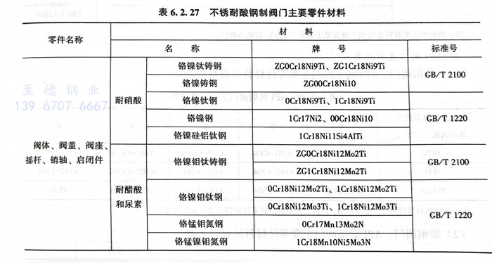 用(yong)于公稱壓力(li)PN≤6.4MPa,溫度(du)低于或等于200℃的(de)硝酸(suan)、醋酸(suan)等介質的(de)不銹耐酸(suan)鋼制(zhi)閥門(men),主要零件材料按(an)表6.2.27選用(yong)。
