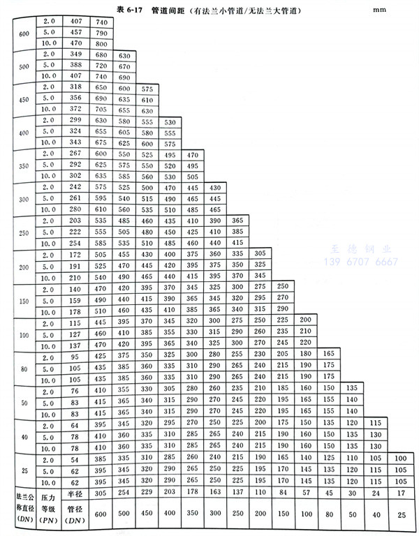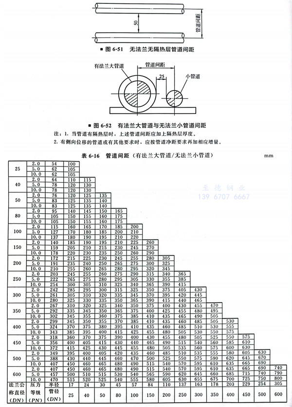 ②. 在(zai)管(guan)架上(shang)并排布置(zhi)的無(wu)(wu)法(fa)蘭(lan)管(guan)道(dao)無(wu)(wu)論(lun)有(you)無(wu)(wu)隔(ge)(ge)熱層(ceng),管(guan)道(dao)外表(biao)面凈(jing)距不應(ying)小于50mm。無(wu)(wu)法(fa)蘭(lan)無(wu)(wu)隔(ge)(ge)熱層(ceng)管(guan)道(dao)間(jian)距見(jian)圖(tu)(tu)6-51和(he)表(biao)6-15。在(zai)管(guan)架上(shang)并排布置(zhi)的有(you)法(fa)蘭(lan)管(guan)道(dao)無(wu)(wu)論(lun)有(you)無(wu)(wu)隔(ge)(ge)熱層(ceng),法(fa)蘭(lan)外緣與(yu)相鄰管(guan)道(dao)的凈(jing)距不應(ying)小于25mm。有(you)法(fa)蘭(lan)無(wu)(wu)隔(ge)(ge)熱層(ceng)管(guan)道(dao)間(jian)距見(jian)圖(tu)(tu)6-52、圖(tu)(tu)6-53、表(biao)6-16和(he)表(biao)6-17。