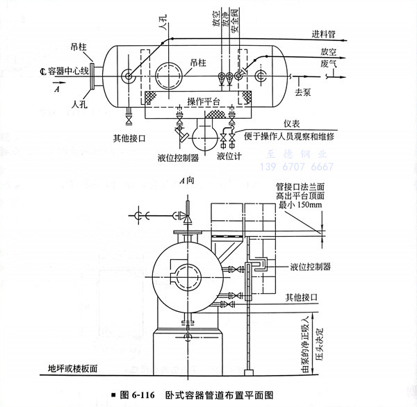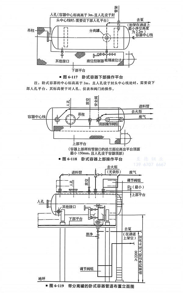 臥式(shi)容(rong)(rong)器的(de)管道(dao)布置(zhi)(圖(tu)6-116~圖(tu)6-118),帶分離罐的(de)臥式(shi)容(rong)(rong)器管道(dao)布置(zhi)立面圖(tu)(圖(tu)6-119)