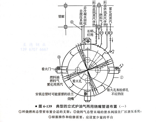 ①. 為了在負荷波動時,仍然保證穩定地供給各加熱(re)爐的噴嘴燃料油,供油量應比用油量大2~3倍。因此,燃料油系統管道要設循環管,燃料油管道引自主管架,繞加熱爐一周再返回主管架,在主管架上有燃料油來回的管道。噴嘴上的燃料油管由燃料油主管的側面或下部引出。