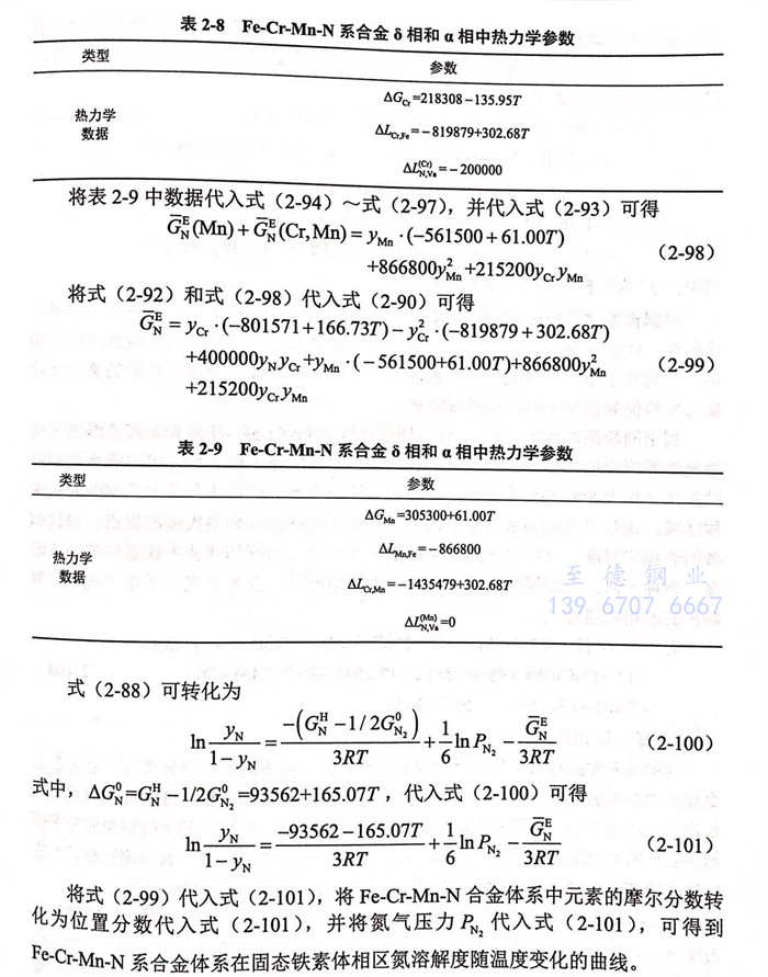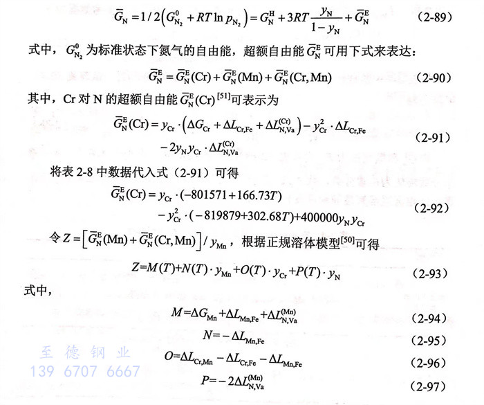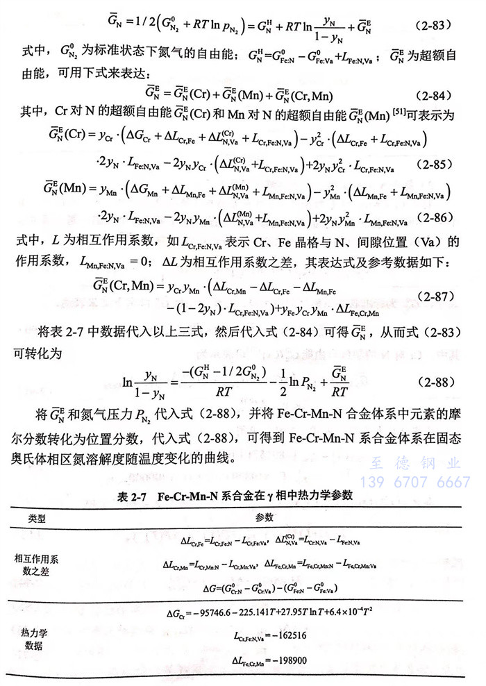 表2-11給出了(le)1000~1200℃范圍(wei)內,N與合金元素Cr、Mn的活(huo)度相互作用系(xi)數(shu)和溫度之間的關(guan)系(xi)。根據(ju)Wagner模型,超額吉布斯自(zi)由能可以用活(huo)度相互作用系(xi)數(shu)表示為