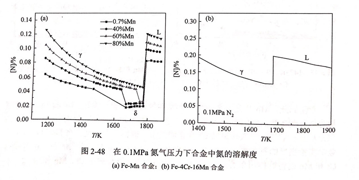 一般而言,不銹鋼熔體在凝固過程中首先生成δ-Fe相,而氮在δ-Fe中的溶解度遠低于在液相和奧氏體相中的溶解度(如圖2-42所示,容易使鋼中的氮析出并形成氮氣孔。因此,探究影響固相中氮溶解度的因素,并建立合理的固相溶解度模型,對高(gao)氮不銹鋼(gang)的成分設計和凝固過程的控制具有重要意義。