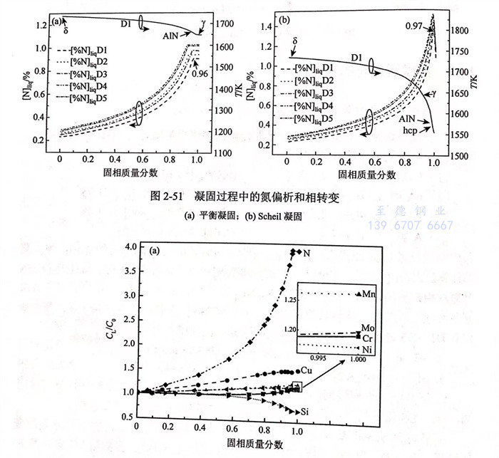 在(zai)平(ping)衡(heng)(heng)(heng)和(he)(he)Scheil凝(ning)(ning)固(gu)(gu)(gu)過(guo)程(cheng)(cheng)中(zhong),D1~D5鑄錠內,[%N]uiq隨(sui)固(gu)(gu)(gu)相(xiang)(xiang)(xiang)(xiang)(xiang)(xiang)質量分(fen)數(shu)(shu)(shu)的(de)(de)(de)(de)變(bian)化(hua)趨勢完全一致。以(yi)D1為例(li),對平(ping)衡(heng)(heng)(heng)凝(ning)(ning)固(gu)(gu)(gu)而(er)(er)言[圖2-51(a)],貧(pin)氮(dan)(dan)相(xiang)(xiang)(xiang)(xiang)(xiang)(xiang)(鐵素(su)體(ti)相(xiang)(xiang)(xiang)(xiang)(xiang)(xiang)δ)的(de)(de)(de)(de)不(bu)斷(duan)形成[78],導(dao)致氮(dan)(dan)在(zai)殘余(yu)液相(xiang)(xiang)(xiang)(xiang)(xiang)(xiang)中(zhong)大(da)(da)量富(fu)集(ji)(ji)(ji),[%N]iq快(kuai)速(su)增(zeng)(zeng)(zeng)大(da)(da),直到固(gu)(gu)(gu)相(xiang)(xiang)(xiang)(xiang)(xiang)(xiang)質量分(fen)數(shu)(shu)(shu)達(da)到0.96左(zuo)右。隨(sui)后,富(fu)氮(dan)(dan)相(xiang)(xiang)(xiang)(xiang)(xiang)(xiang)(奧(ao)氏體(ti)相(xiang)(xiang)(xiang)(xiang)(xiang)(xiang)γ和(he)(he)AIN)持續形成,由于富(fu)氮(dan)(dan)相(xiang)(xiang)(xiang)(xiang)(xiang)(xiang)中(zhong)氮(dan)(dan)的(de)(de)(de)(de)平(ping)衡(heng)(heng)(heng)分(fen)配系數(shu)(shu)(shu)和(he)(he)溶解度均大(da)(da)于貧(pin)氮(dan)(dan)相(xiang)(xiang)(xiang)(xiang)(xiang)(xiang)[25,771,致使(shi)[%N]iq的(de)(de)(de)(de)增(zeng)(zeng)(zeng)長(chang)速(su)率陡降(jiang)(jiang),致使(shi)[%N]iq在(zai)隨(sui)后的(de)(de)(de)(de)凝(ning)(ning)固(gu)(gu)(gu)過(guo)程(cheng)(cheng)中(zhong)幾(ji)乎保持不(bu)變(bian)。氮(dan)(dan)、鎳和(he)(he)錳一起富(fu)集(ji)(ji)(ji)在(zai)富(fu)氮(dan)(dan)相(xiang)(xiang)(xiang)(xiang)(xiang)(xiang)γ奧(ao)氏體(ti)中(zhong),且富(fu)氮(dan)(dan)相(xiang)(xiang)(xiang)(xiang)(xiang)(xiang)γ奧(ao)氏體(ti)中(zhong)氮(dan)(dan)質量分(fen)數(shu)(shu)(shu)明顯(xian)大(da)(da)于貧(pin)氮(dan)(dan)鐵素(su)體(ti)相(xiang)(xiang)(xiang)(xiang)(xiang)(xiang)δ,差值(zhi)可達(da)0.28%.在(zai)Scheil凝(ning)(ning)固(gu)(gu)(gu)過(guo)程(cheng)(cheng)中(zhong),[%N]1iq變(bian)化(hua)規律如(ru)圖2-51(b)所示,當固(gu)(gu)(gu)相(xiang)(xiang)(xiang)(xiang)(xiang)(xiang)質量分(fen)數(shu)(shu)(shu)小于0.97時(shi),[%N]iq隨(sui)著固(gu)(gu)(gu)相(xiang)(xiang)(xiang)(xiang)(xiang)(xiang)質量分(fen)數(shu)(shu)(shu)的(de)(de)(de)(de)增(zeng)(zeng)(zeng)加而(er)(er)快(kuai)速(su)增(zeng)(zeng)(zeng)大(da)(da),隨(sui)后[%N]iq增(zeng)(zeng)(zeng)長(chang)速(su)率陡降(jiang)(jiang),同(tong)時(shi)[%N]iiq也隨(sui)之發生斷(duan)裂(lie)式下(xia)降(jiang)(jiang),明顯(xian)區別于平(ping)衡(heng)(heng)(heng)凝(ning)(ning)固(gu)(gu)(gu)。與平(ping)衡(heng)(heng)(heng)凝(ning)(ning)固(gu)(gu)(gu)相(xiang)(xiang)(xiang)(xiang)(xiang)(xiang)比,由于Scheil凝(ning)(ning)固(gu)(gu)(gu)固(gu)(gu)(gu)相(xiang)(xiang)(xiang)(xiang)(xiang)(xiang)無擴散(san),導(dao)致氮(dan)(dan)、錳、鉻和(he)(he)鉬在(zai)殘余(yu)液相(xiang)(xiang)(xiang)(xiang)(xiang)(xiang)中(zhong)的(de)(de)(de)(de)富(fu)集(ji)(ji)(ji)程(cheng)(cheng)度明顯(xian)大(da)(da)于其在(zai)平(ping)衡(heng)(heng)(heng)凝(ning)(ning)固(gu)(gu)(gu)中(zhong)的(de)(de)(de)(de)富(fu)集(ji)(ji)(ji)(圖2-52),促進了氮(dan)(dan)化(hua)物[密排(pai)六方(hcp)相(xiang)(xiang)(xiang)(xiang)(xiang)(xiang)]的(de)(de)(de)(de)形成,進而(er)(er)致使(shi)[%N]iq發生斷(duan)裂(lie)式下(xia)降(jiang)(jiang)[圖2-51(b)]。