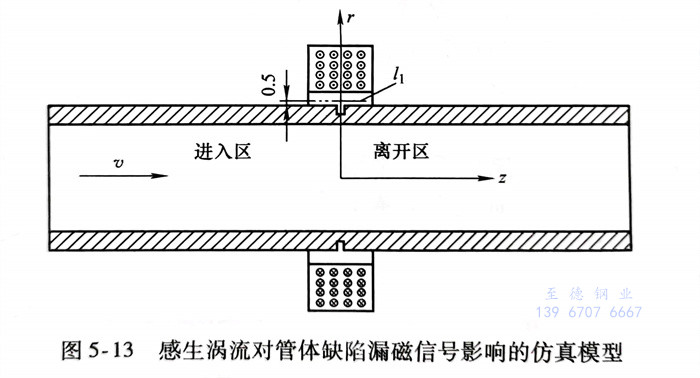 隨著不銹鋼(gang)管(guan)(guan)的(de)(de)進(jin)(jin)一步深入磁(ci)(ci)化(hua)(hua)(hua)(hua)線(xian)圈(quan)(quan),鋼(gang)管(guan)(guan)管(guan)(guan)體與軸向(xiang)磁(ci)(ci)化(hua)(hua)(hua)(hua)場(chang)(chang)耦合。由于磁(ci)(ci)化(hua)(hua)(hua)(hua)線(xian)圈(quan)(quan)內(nei)部(bu)磁(ci)(ci)介(jie)質總(zong)(zong)量基(ji)本(ben)不變,磁(ci)(ci)化(hua)(hua)(hua)(hua)線(xian)圈(quan)(quan)磁(ci)(ci)通(tong)總(zong)(zong)量也(ye)基(ji)本(ben)保持不變,因(yin)此磁(ci)(ci)化(hua)(hua)(hua)(hua)線(xian)圈(quan)(quan)內(nei)部(bu)基(ji)本(ben)無感(gan)(gan)(gan)生(sheng)(sheng)(sheng)電(dian)流(liu)產(chan)生(sheng)(sheng)(sheng)。此時產(chan)生(sheng)(sheng)(sheng)磁(ci)(ci)場(chang)(chang)的(de)(de)電(dian)流(liu)源(yuan)主要包(bao)括原(yuan)始磁(ci)(ci)化(hua)(hua)(hua)(hua)電(dian)流(liu)I6和鋼(gang)管(guan)(guan)中的(de)(de)感(gan)(gan)(gan)生(sheng)(sheng)(sheng)渦流(liu)J。在進(jin)(jin)入區,鋼(gang)管(guan)(guan)中形成與原(yuan)始磁(ci)(ci)化(hua)(hua)(hua)(hua)電(dian)流(liu)1。方(fang)(fang)向(xiang)相反的(de)(de)感(gan)(gan)(gan)生(sheng)(sheng)(sheng)渦流(liu)J1;在離(li)開(kai)區,鋼(gang)管(guan)(guan)中形成與原(yuan)始磁(ci)(ci)化(hua)(hua)(hua)(hua)電(dian)流(liu)16方(fang)(fang)向(xiang)相同(tong)的(de)(de)感(gan)(gan)(gan)生(sheng)(sheng)(sheng)渦流(liu)J2,最終,可(ke)獲(huo)得(de)鋼(gang)管(guan)(guan)管(guan)(guan)體處磁(ci)(ci)場(chang)(chang)的(de)(de)總(zong)(zong)體分布,如圖(tu)5-15b所示。從圖(tu)中可(ke)以(yi)看出,進(jin)(jin)入區感(gan)(gan)(gan)生(sheng)(sheng)(sheng)渦流(liu)磁(ci)(ci)場(chang)(chang)H與原(yuan)始磁(ci)(ci)化(hua)(hua)(hua)(hua)場(chang)(chang)Ho方(fang)(fang)向(xiang)相反,而離(li)開(kai)區感(gan)(gan)(gan)生(sheng)(sheng)(sheng)渦流(liu)磁(ci)(ci)場(chang)(chang)H2J與原(yuan)始磁(ci)(ci)化(hua)(hua)(hua)(hua)場(chang)(chang)方(fang)(fang)向(xiang)相同(tong),此時,總(zong)(zong)磁(ci)(ci)化(hua)(hua)(hua)(hua)場(chang)(chang)H為