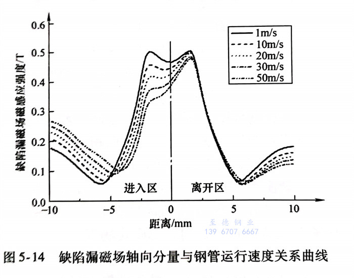 從圖5-14中可以看出,隨(sui)(sui)著(zhu)鋼管(guan)運行速度(du)的不(bu)(bu)斷提高,缺陷(xian)漏(lou)磁(ci)場(chang)(chang)(chang)軸向分量中心幅值不(bu)(bu)斷降低,并(bing)(bing)且(qie)離開(kai)區(qu)的漏(lou)磁(ci)場(chang)(chang)(chang)強(qiang)度(du)大于進(jin)入區(qu)。究其原因,由(you)于鋼管(guan)中存在不(bu)(bu)同方向的感生渦流(liu),導致離開(kai)區(qu)磁(ci)場(chang)(chang)(chang)強(qiang)度(du)大于進(jin)入區(qu)磁(ci)場(chang)(chang)(chang)強(qiang)度(du)。并(bing)(bing)且(qie),隨(sui)(sui)著(zhu)檢測速度(du)的不(bu)(bu)斷提高,磁(ci)化場(chang)(chang)(chang)對稱中心逐漸移至離開(kai)區(qu)內(nei)。