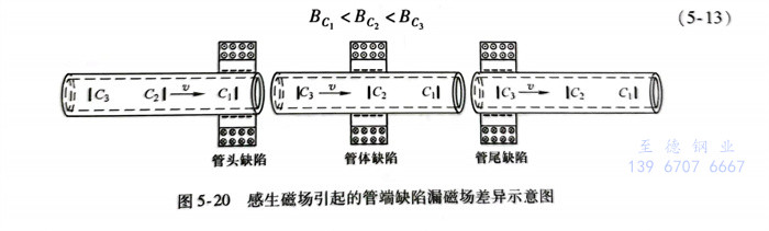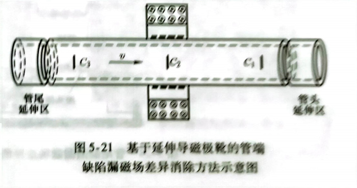 感(gan)(gan)(gan)生(sheng)(sheng)磁(ci)(ci)場(chang)(chang)(chang)會引起鋼(gang)管(guan)(guan)管(guan)(guan)端磁(ci)(ci)化狀態發生(sheng)(sheng)變化,進(jin)(jin)一(yi)步導致位于(yu)(yu)鋼(gang)管(guan)(guan)管(guan)(guan)頭(tou)、管(guan)(guan)體(ti)(ti)和(he)管(guan)(guan)尾的(de)(de)具(ju)有(you)相(xiang)(xiang)同(tong)尺寸(cun)的(de)(de)缺陷產生(sheng)(sheng)不(bu)同(tong)的(de)(de)漏(lou)磁(ci)(ci)場(chang)(chang)(chang)強度。如圖5-20所(suo)示(shi),在(zai)感(gan)(gan)(gan)生(sheng)(sheng)磁(ci)(ci)場(chang)(chang)(chang)的(de)(de)作用(yong)下(xia),位于(yu)(yu)鋼(gang)管(guan)(guan)管(guan)(guan)頭(tou)、管(guan)(guan)體(ti)(ti)和(he)管(guan)(guan)尾處(chu)的(de)(de)缺陷C1C2和(he)C3產產生(sheng)(sheng)的(de)(de)漏(lou)磁(ci)(ci)場(chang)(chang)(chang)Bc1、Bc2和(he)Bc3的(de)(de)強度依次增大,為(wei)消(xiao)(xiao)除感(gan)(gan)(gan)生(sheng)(sheng)磁(ci)(ci)場(chang)(chang)(chang)引起的(de)(de)管(guan)(guan)端漏(lou)磁(ci)(ci)場(chang)(chang)(chang)差異,將(jiang)(jiang)感(gan)(gan)(gan)生(sheng)(sheng)磁(ci)(ci)場(chang)(chang)(chang)的(de)(de)影響由(you)鋼(gang)管(guan)(guan)本體(ti)(ti)轉(zhuan)移(yi)(yi)到延伸(shen)區(qu)內。如圖5-21所(suo)示(shi),在(zai)鋼(gang)管(guan)(guan)端部(bu)補(bu)充鐵磁(ci)(ci)性物(wu)質(zhi)(zhi),使鋼(gang)管(guan)(guan)整體(ti)(ti)長度向(xiang)兩端延伸(shen),從(cong)而(er)在(zai)端部(bu)發生(sheng)(sheng)的(de)(de)電磁(ci)(ci)感(gan)(gan)(gan)應現象將(jiang)(jiang)轉(zhuan)移(yi)(yi)到延伸(shen)區(qu)內。由(you)于(yu)(yu)延伸(shen)區(qu)的(de)(de)存(cun)在(zai),當鋼(gang)管(guan)(guan)端部(bu)進(jin)(jin)入和(he)離開(kai)磁(ci)(ci)化線(xian)(xian)圈(quan)時,磁(ci)(ci)化線(xian)(xian)圈(quan)內部(bu)磁(ci)(ci)介質(zhi)(zhi)總量(liang)已基(ji)本進(jin)(jin)入穩(wen)定狀態,線(xian)(xian)圈(quan)磁(ci)(ci)通量(liang)保(bao)持恒定而(er)不(bu)會產生(sheng)(sheng)感(gan)(gan)(gan)生(sheng)(sheng)電流;由(you)于(yu)(yu)在(zai)鋼(gang)管(guan)(guan)進(jin)(jin)入區(qu)和(he)離開(kai)區(qu)同(tong)時產生(sheng)(sheng)反向(xiang)的(de)(de)感(gan)(gan)(gan)生(sheng)(sheng)渦(wo)流磁(ci)(ci)場(chang)(chang)(chang),從(cong)而(er)減弱(ruo)了單一(yi)方(fang)(fang)向(xiang)感(gan)(gan)(gan)生(sheng)(sheng)渦(wo)流磁(ci)(ci)場(chang)(chang)(chang)的(de)(de)劇(ju)烈影響。將(jiang)(jiang)鋼(gang)管(guan)(guan)端部(bu)進(jin)(jin)行延伸(shen)之后,管(guan)(guan)端缺陷漏(lou)磁(ci)(ci)場(chang)(chang)(chang)差異與管(guan)(guan)體(ti)(ti)相(xiang)(xiang)似(si),僅存(cun)在(zai)鋼(gang)管(guan)(guan)進(jin)(jin)入區(qu)和(he)離開(kai)區(qu)產生(sheng)(sheng)的(de)(de)感(gan)(gan)(gan)生(sheng)(sheng)渦(wo)流磁(ci)(ci)場(chang)(chang)(chang),因此可采(cai)用(yong)管(guan)(guan)體(ti)(ti)缺陷漏(lou)磁(ci)(ci)場(chang)(chang)(chang)差異消(xiao)(xiao)除方(fang)(fang)法進(jin)(jin)一(yi)步處(chu)理。