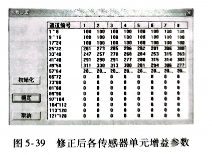 為(wei)消除感(gan)生磁場引起的管(guan)體同(tong)尺寸(cun)缺(que)陷漏磁場差異,以(yi)(yi)圓環(huan)作為(wei)標(biao)(biao)定(ding)(ding)信(xin)(xin)號(hao)源對陣列(lie)傳感(gan)單元增益進(jin)行修(xiu)正(zheng),樣管(guan)如(ru)(ru)圖(tu)(tu)(tu)(tu)5-36所(suo)(suo)(suo)示(shi)(shi)(shi)。檢(jian)測(ce)信(xin)(xin)號(hao)系(xi)統(tong)共32個通道(dao),初始采(cai)集(ji)時各通道(dao)增益統(tong)一(yi)設(she)置為(wei)200,如(ru)(ru)圖(tu)(tu)(tu)(tu)5-37所(suo)(suo)(suo)示(shi)(shi)(shi)。當樣管(guan)以(yi)(yi)速度1.0m/s通過(guo)檢(jian)測(ce)探頭時,獲(huo)(huo)得(de)編號(hao)25~32八個通道(dao)缺(que)陷漏磁信(xin)(xin)號(hao)波(bo)形(xing),如(ru)(ru)圖(tu)(tu)(tu)(tu)5-38所(suo)(suo)(suo)示(shi)(shi)(shi),其中每一(yi)條曲線代(dai)表一(yi)個通道(dao)。從圖(tu)(tu)(tu)(tu)中可以(yi)(yi)看出(chu),標(biao)(biao)定(ding)(ding)圓環(huan)在各傳感(gan)單元中產生的漏磁信(xin)(xin)號(hao)幅值不同(tong)。進(jin)一(yi)步,將(jiang)(jiang)目標(biao)(biao)信(xin)(xin)號(hao)幅值Vs設(she)置為(wei)90,根據式(5-12)算法獲(huo)(huo)得(de)各通道(dao)的修(xiu)正(zheng)參(can)數,如(ru)(ru)圖(tu)(tu)(tu)(tu)5-39所(suo)(suo)(suo)示(shi)(shi)(shi)。將(jiang)(jiang)標(biao)(biao)定(ding)(ding)圓環(huan)再次以(yi)(yi)相(xiang)同(tong)速度通過(guo)橫向檢(jian)測(ce)系(xi)統(tong)時獲(huo)(huo)得(de)如(ru)(ru)圖(tu)(tu)(tu)(tu)5-40所(suo)(suo)(suo)示(shi)(shi)(shi)的檢(jian)測(ce)信(xin)(xin)號(hao),其中一(yi)條曲線為(wei)一(yi)個通道(dao)。從圖(tu)(tu)(tu)(tu)中可以(yi)(yi)看出(chu),經過(guo)增益修(xiu)正(zheng)之后(hou),各通道(dao)之間的缺(que)陷信(xin)(xin)號(hao)差異基本得(de)到消除。