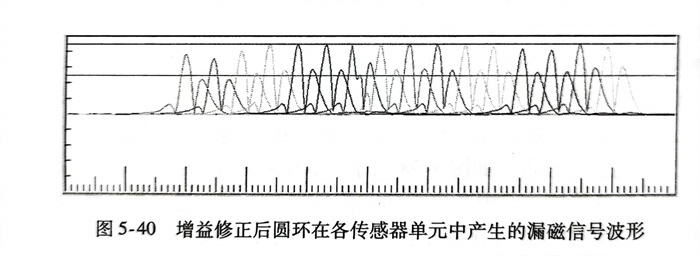 隨著檢測速度(du)的不斷提高(gao),不銹鋼管(guan)離開(kai)區磁感應(ying)強度(du)逐(zhu)漸大于(yu)(yu)進入區,從(cong)而導致位于(yu)(yu)離開(kai)區的缺陷漏磁場強度(du)大于(yu)(yu)位于(yu)(yu)進入區的缺陷漏磁場強度(du),感(gan)生(sheng)磁場造成處于不同空間位置對應傳(chuan)感(gan)器(qi)單元(yuan)檢測到了不一致(zhi)的(de)缺(que)陷漏(lou)磁場信號。消除(chu)(chu)(chu)管(guan)(guan)體缺(que)陷漏(lou)磁場差異(yi)有(you)兩種(zhong)途徑:一方面,可以通過消除(chu)(chu)(chu)鋼管(guan)(guan)中的(de)感(gan)生(sheng)渦(wo)流來(lai)消除(chu)(chu)(chu)磁化狀態的(de)差異(yi);另一方面,還(huan)可采取修(xiu)正傳(chuan)感(gan)單元(yuan)的(de)增益使檢測信號達(da)到一致(zhi)。由于鋼管(guan)(guan)內產生(sheng)的(de)感(gan)生(sheng)渦(wo)流無(wu)法消除(chu)(chu)(chu),為此,提出通過修(xiu)正陣(zhen)列傳(chuan)感(gan)單元(yuan)增益來(lai)消除(chu)(chu)(chu)同尺(chi)寸缺(que)陷產生(sheng)的(de)漏(lou)磁信號差異(yi),如圖(tu)5-19所示(shi)。