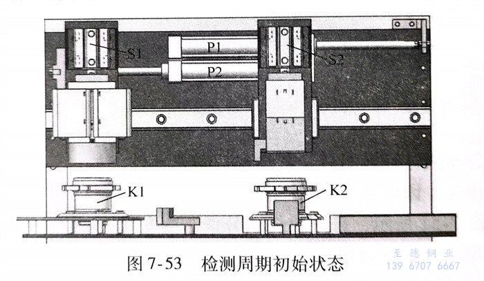 每個檢(jian)(jian)測(ce)周(zhou)(zhou)(zhou)期開始(shi)時,氣(qi)缸P1和P2處于伸展狀態(tai),氣(qi)缸S1和S2處于收縮狀態(tai),檢(jian)(jian)測(ce)平(ping)臺(tai)的上料工(gong)位(wei)放置著(zhu)剛剛被填充進來的待檢(jian)(jian)測(ce)軸(zhou)承(cheng)K1,分(fen)選工(gong)位(wei)上放置著(zhu)上一周(zhou)(zhou)(zhou)期已經完成檢(jian)(jian)測(ce)的軸(zhou)承(cheng)K2,這里假設軸(zhou)承(cheng)K1帶有可被檢(jian)(jian)測(ce)到(dao)的缺陷(xian)(xian),軸(zhou)承(cheng)K2沒有缺陷(xian)(xian),因(yin)而K2在上一檢(jian)(jian)測(ce)周(zhou)(zhou)(zhou)期結束后沒有被分(fen)選裝置推入回收箱(xiang)。檢(jian)(jian)測(ce)周(zhou)(zhou)(zhou)期初始(shi)狀態(tai)如(ru)圖7-53所示。
