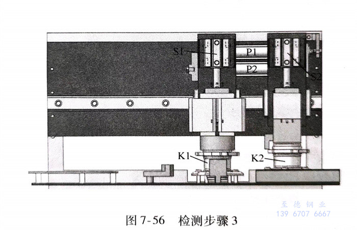 b. 檢測(ce)步驟(zou)2(圖7-55)氣缸S1收(shou)縮,軸(zhou)(zhou)承(cheng)K1被(bei)抬起(qi)。氣缸P2收(shou)縮,軸(zhou)(zhou)承(cheng)K1被(bei)傳送至掃查(cha)工(gong)位。掃查(cha)電(dian)(dian)動機通(tong)電(dian)(dian)開始掃查(cha),漏(lou)磁(ci)檢測(ce)軟件啟動,采集數(shu)據并做出有無缺陷的判(pan)斷(這里(li)假設K1有缺陷,因此系(xi)統(tong)將(jiang)其(qi)判(pan)定為次品)。氣缸S2伸展,退磁(ci)器(qi)下降與上一(yi)周(zhou)期檢測(ce)完成的軸(zhou)(zhou)承(cheng)K2接觸,退磁(ci)器(qi)通(tong)電(dian)(dian),對K2執(zhi)行退磁(ci)工(gong)序。