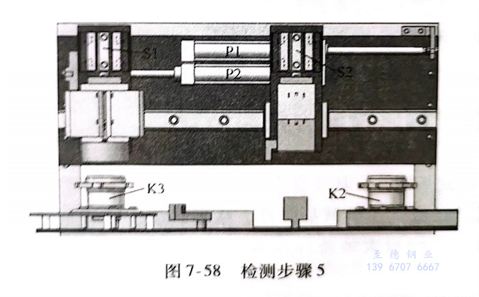 e. 檢測(ce)步(bu)驟(zou)5(圖7-58)氣(qi)缸(gang)P1和P2伸展,磁化器和退磁器回歸到(dao)(dao)原(yuan)始位置,下(xia)一個被(bei)檢測(ce)的軸承(cheng)K3被(bei)裝填到(dao)(dao)上料工位,等(deng)待(dai)下(xia)一個檢測(ce)周期(qi)。