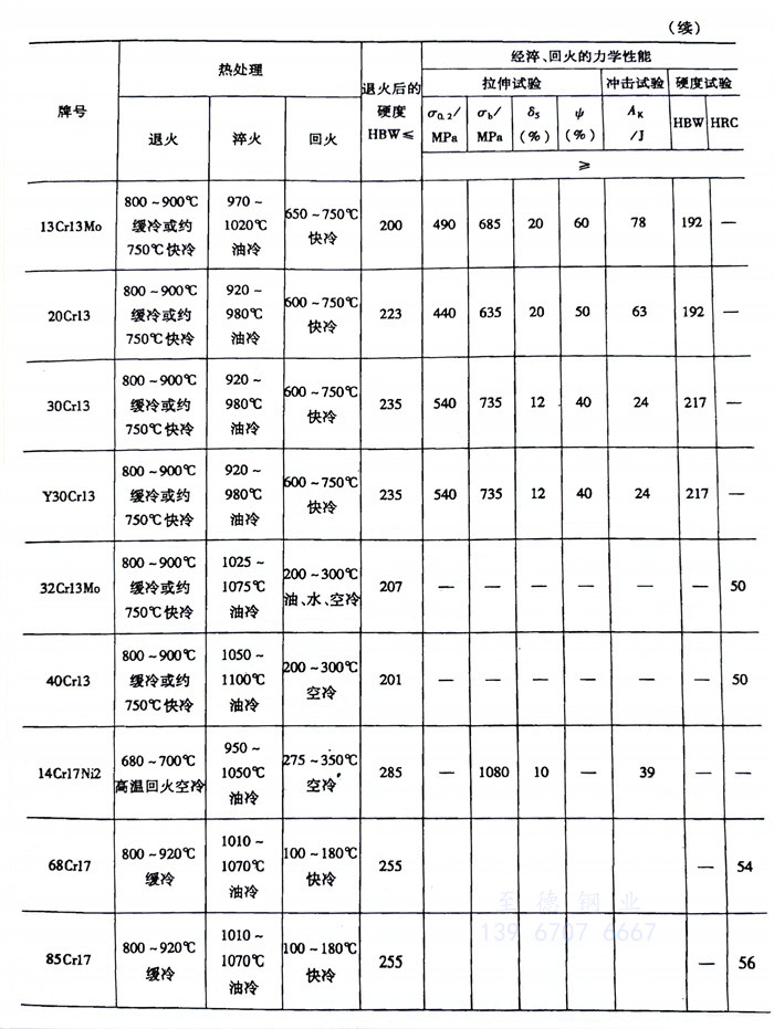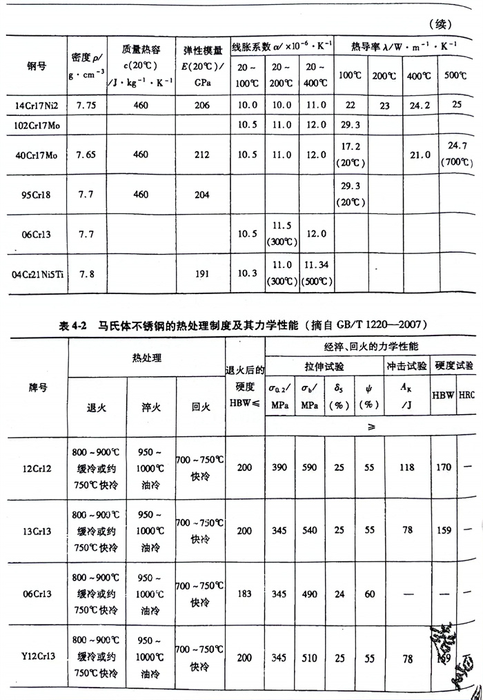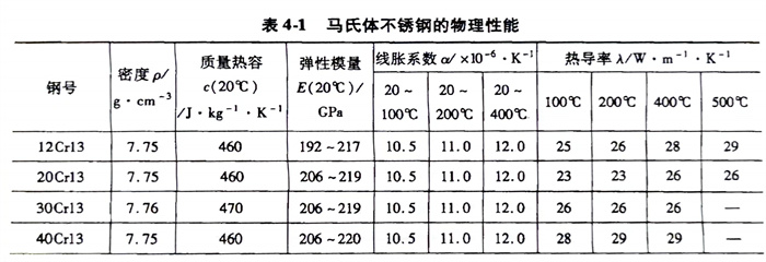 馬氏體不銹鋼管的工藝性能在鋼種介紹中都有詳細的闡述,這里僅介紹一下馬氏體不銹鋼的物理性能(見表4-1),以及熱處理制度和力學性能(見表4-2)。