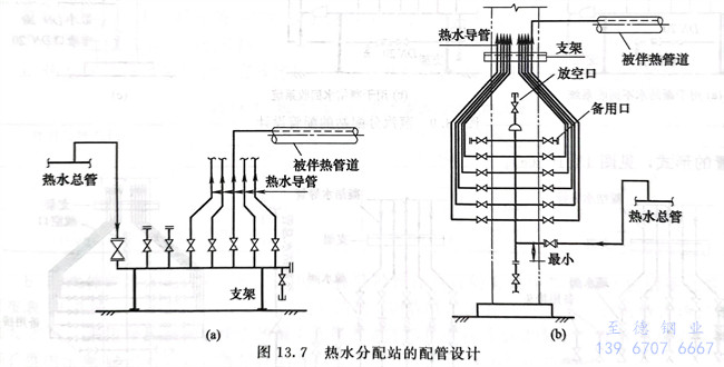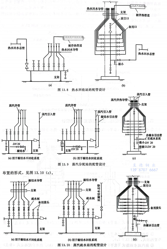 ③. 蒸汽分(fen)配站臥式(shi)(水平)布置(zhi)的形式(shi),見(jian)圖(tu)13.9(a)、(b),熱水分(fen)配站立式(shi)(垂直(zhi))布置(zhi)的形式(shi),見(jian)圖(tu)13.9(c)。
