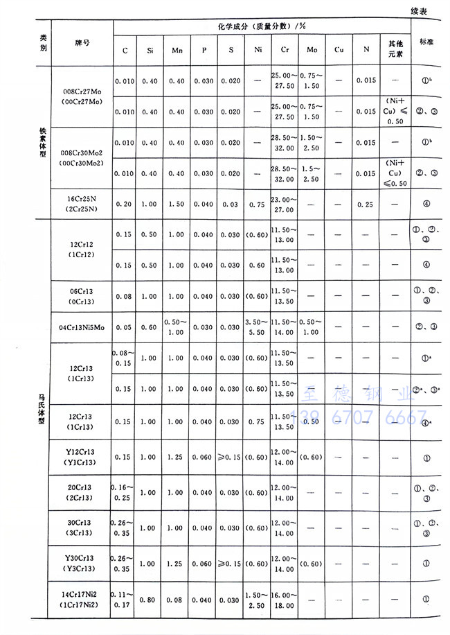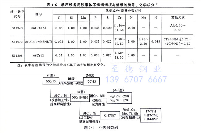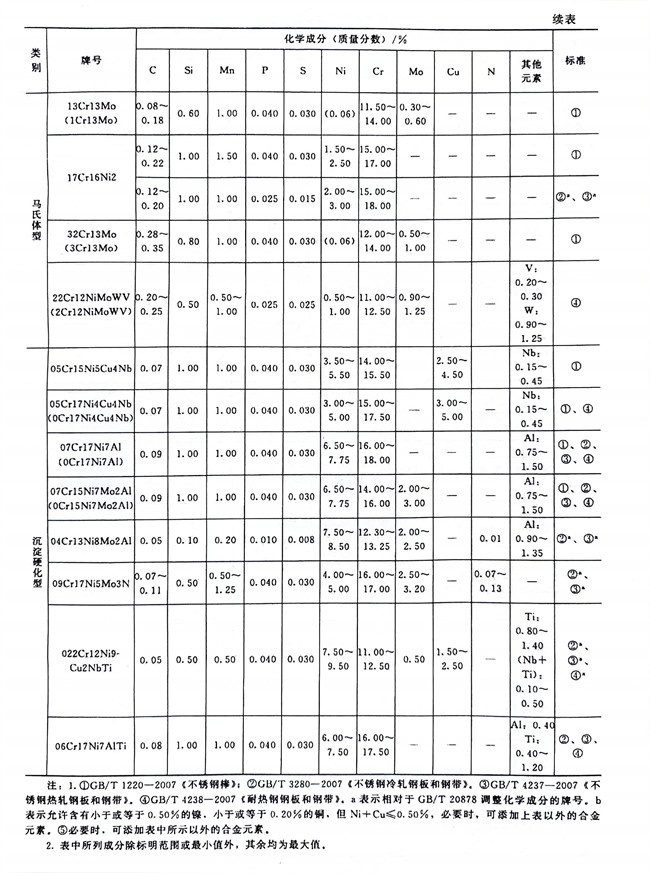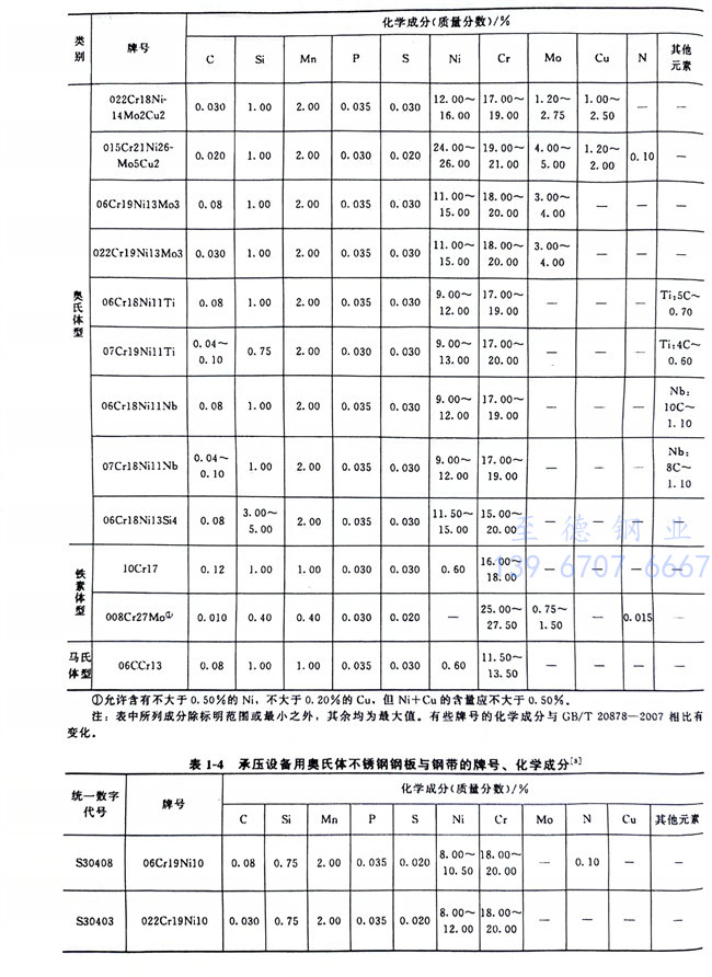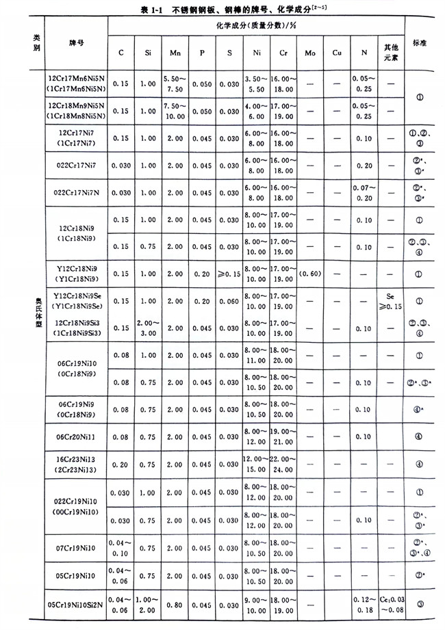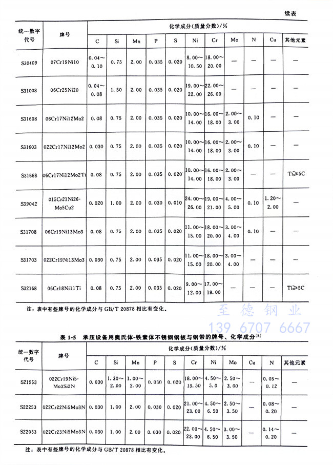 從表1-1~表1-6、表1-8可以看到,不銹鋼和耐熱(re)鋼相互之間的許多牌號的化學成分、力學性能等是相同的,這些牌號的材料既可作為不銹鋼使用,也可作為耐熱鋼使用。