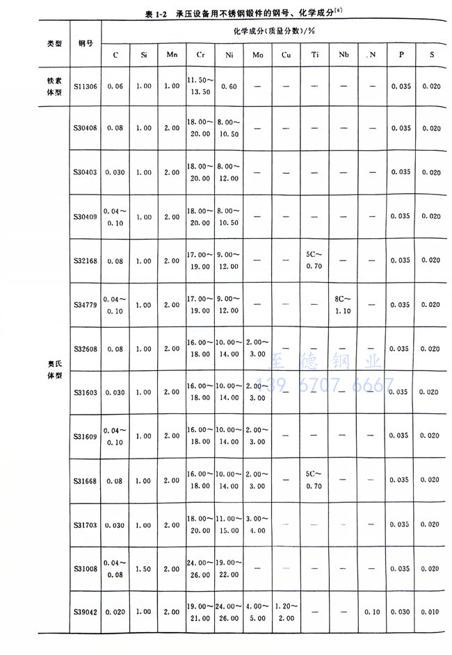 我國至少已制定了62項不銹(xiu)鋼管材料標準(其中國家標準38項,冶金行業標準16項,航空航天標準6項、機械行業標準1項、能源局標準1項),每個標準均規定了材料的化學成分、力學性能等技術要求。在機械工程上應用最多的不銹(xiu)鋼材料(liao)與標準包括GB/T3280-2007《不銹鋼冷軋鋼板和鋼帶》(該標準正在修訂中)、GB/T 4237-2007《不銹鋼熱軋鋼板和鋼帶》(不得用于鍋爐壓力容器制造,該標準正在修訂中)和GB/T 4238-2007《耐熱鋼鋼板和鋼帶》、GB 24511-2009《承壓設備用不銹鋼鋼板及鋼帶》、NB/T 47010-2010(JB/T 4728)《承壓設備用不銹鋼和耐熱鋼鍛件》,常見的不銹鋼牌號、化學成分和類別,見表1-1~表1-6。