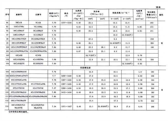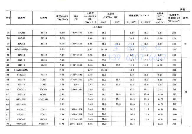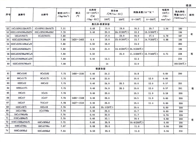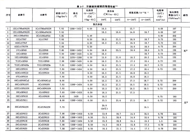 不銹鋼和碳鋼的物理性能數據對照見表1-7。從表中可知,碳鋼的密度略高于鐵素體型和馬氏(shi)體型不銹鋼,而略低于奧氏體型不銹鋼;電阻率按碳鋼、鐵素體型、馬氏體型和奧氏體型不銹鋼排序依次遞增;線脹系數大小的排序也類似,奧氏體型不銹鋼最高而碳鋼最小;碳鋼、鐵素體型和馬氏體型不銹鋼有磁性,奧氏體型不銹鋼無磁性,但其冷加工硬化生成馬氏體相變時將會產生磁性,可用熱處理方法來消除這種馬氏體組織而恢復其無磁性。