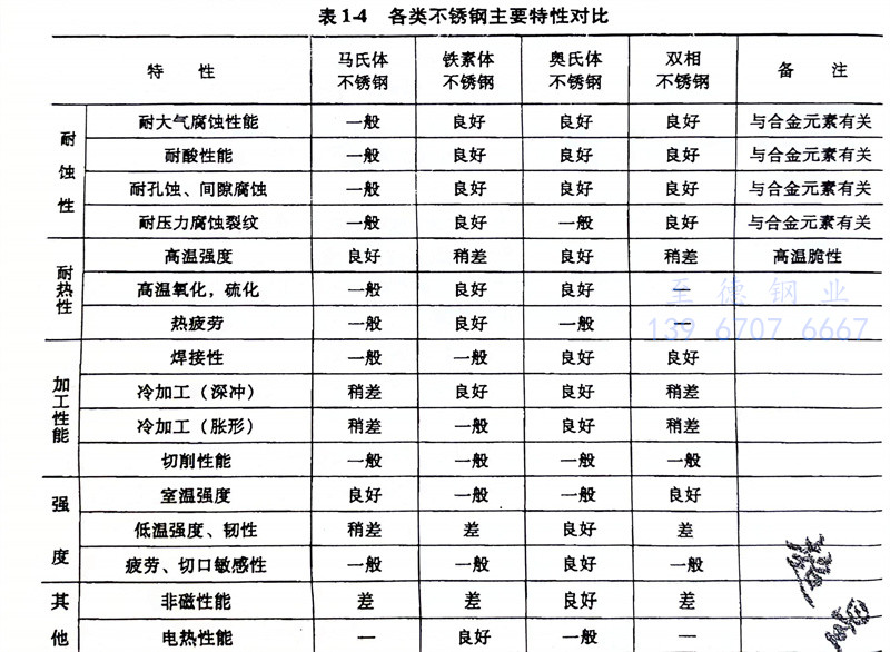 不銹鋼的類別主要有馬氏體不銹鋼、奧氏體不銹鋼、鐵素體不銹鋼、奧氏體-鐵素體雙相不銹鋼以及沉淀硬化型不銹鋼。浙江至德鋼業有限公司本次節主要介紹各類不銹(xiu)鋼的特性、特點以及典型鋼號的用途。其中,馬氏體不銹鋼、奧氏體不銹鋼、鐵素體不銹鋼、奧氏體-鐵素體雙相不銹鋼的主要特性比較見表1-4,各類不銹鋼的特點、鋼號和用途見表1-5。