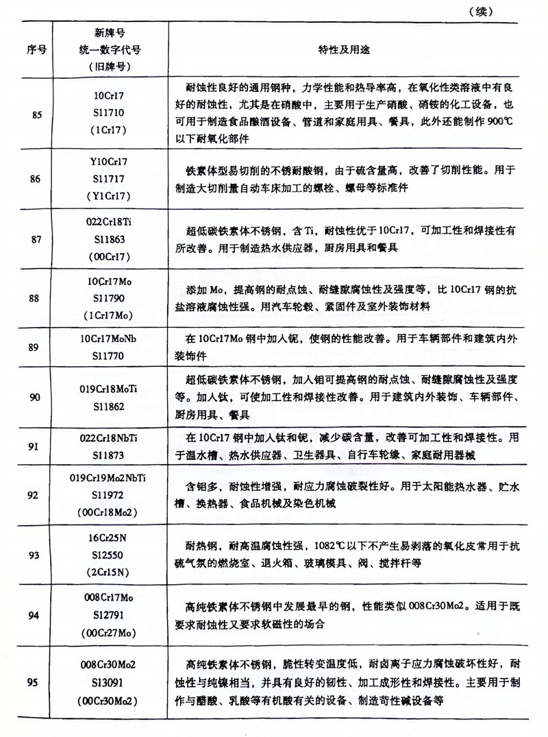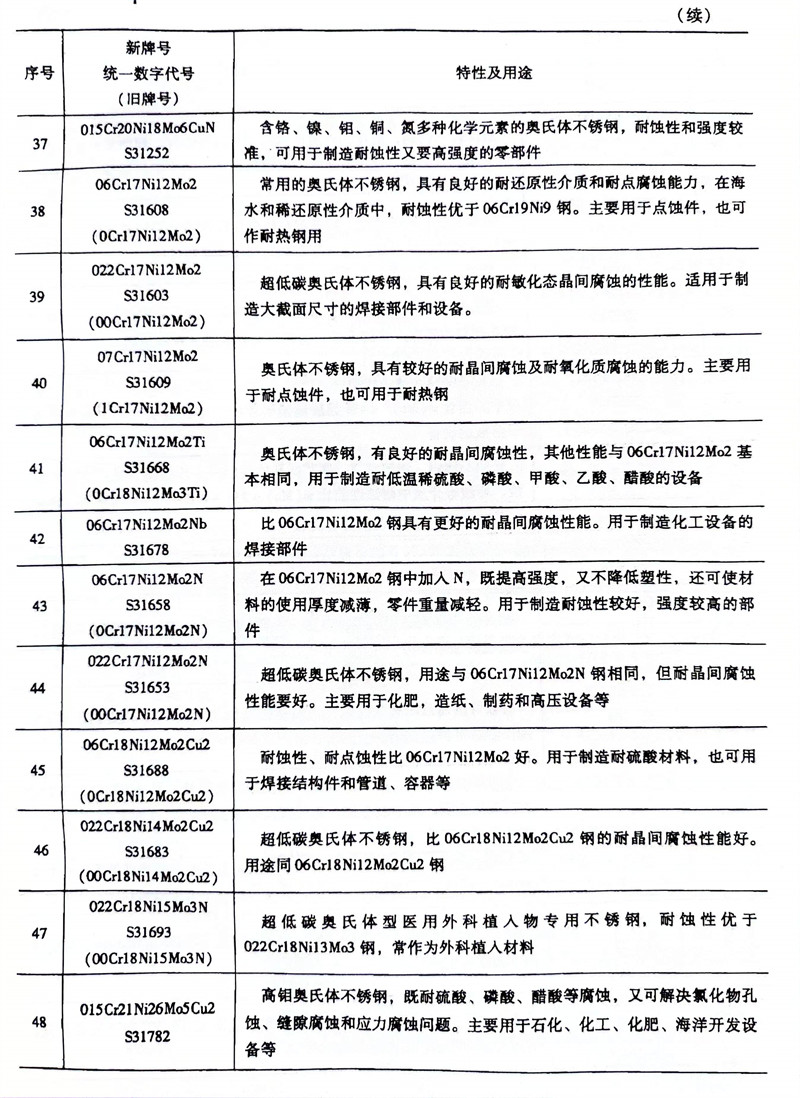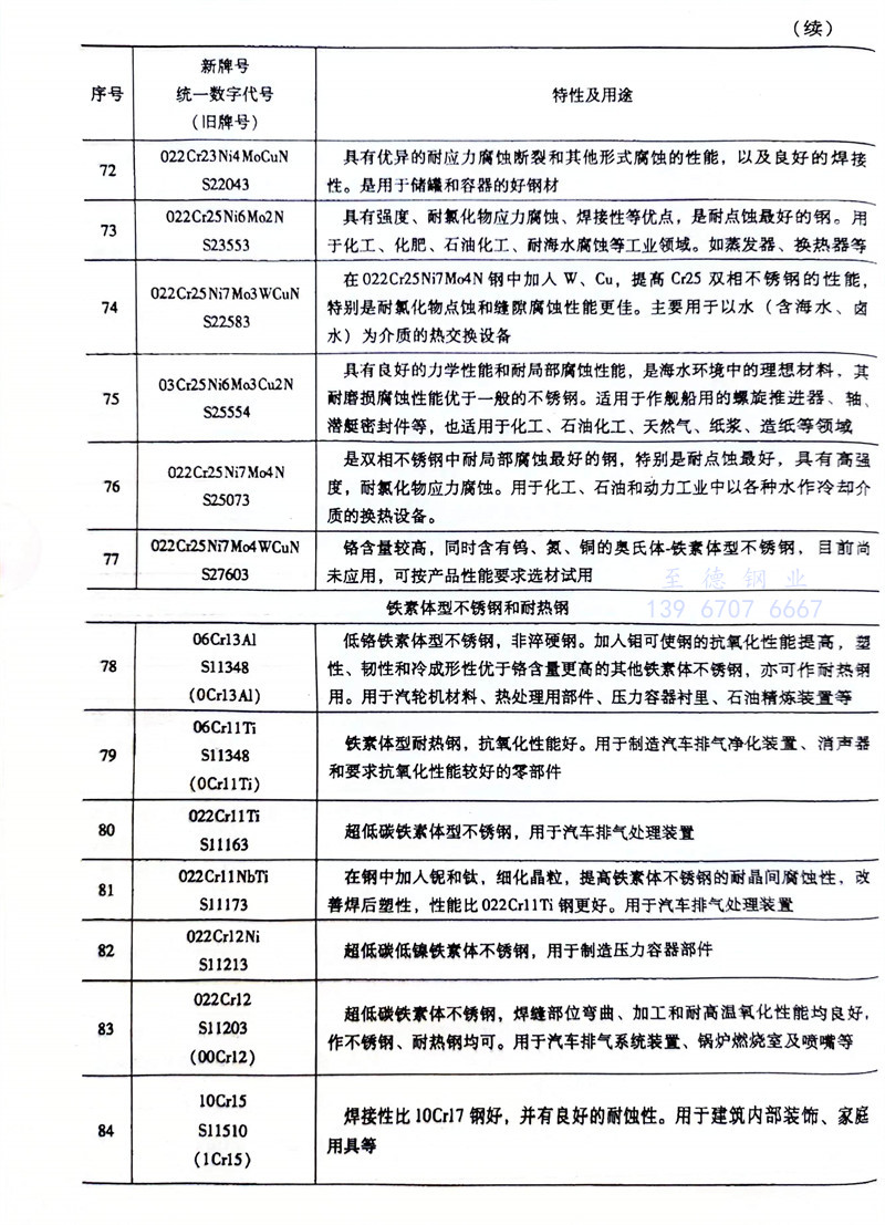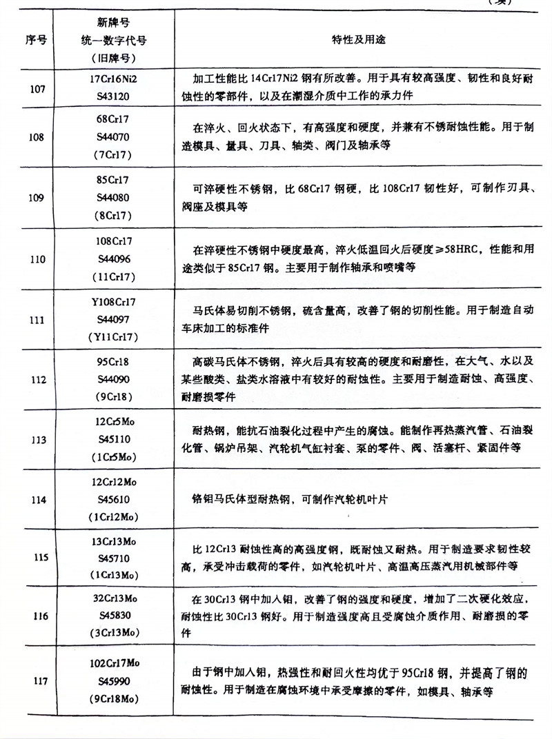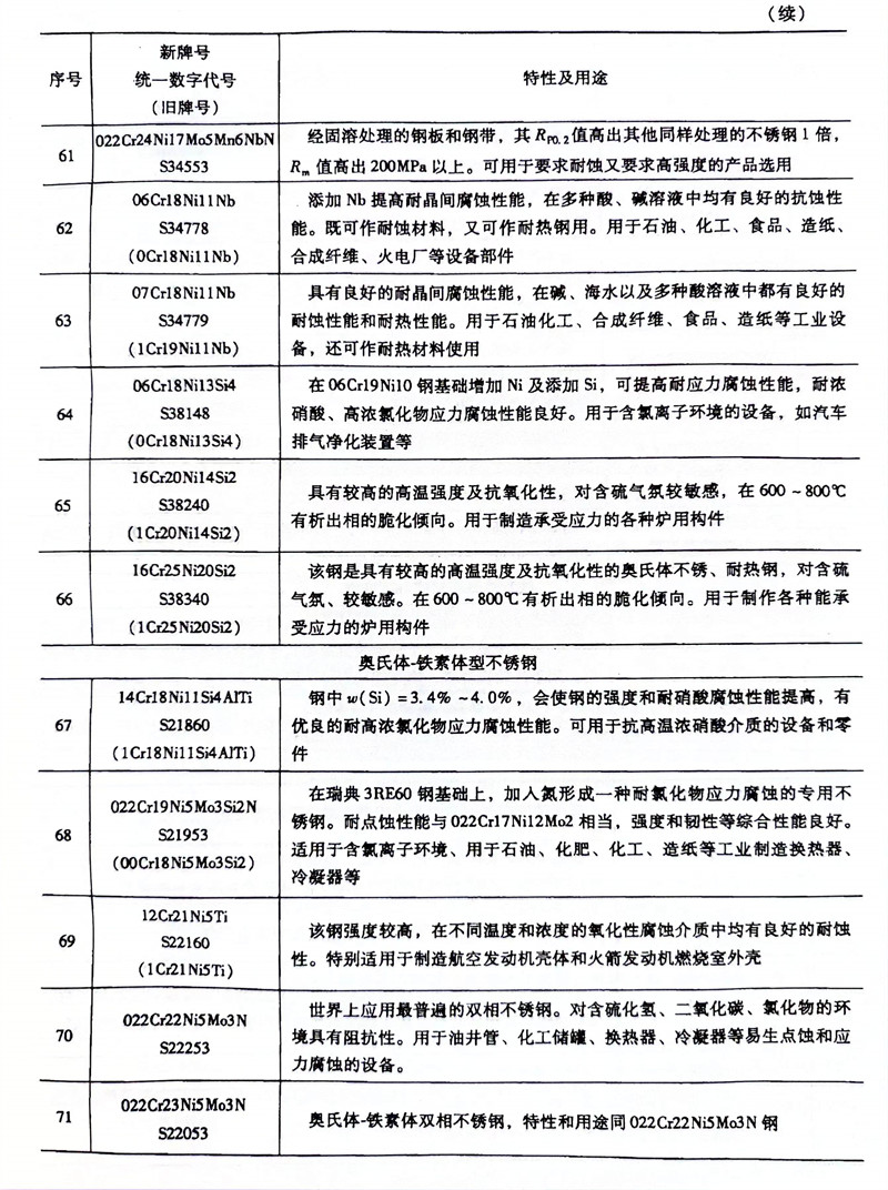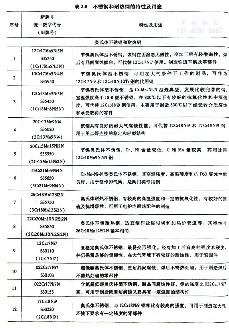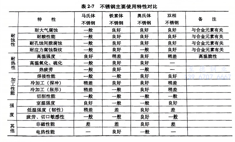 不銹鋼的選擇在大的方面可根據前面的方法選用。對于具體選擇哪一種不銹鋼,還應根據每一個不銹鋼鋼種的基本特性和相關因素來選擇適合生產需要、經濟上合理、技術上先進的不銹鋼。下面簡要介紹各類不銹鋼使用特性對比(見表2-7)、以及每種不銹鋼和耐熱鋼的特性和用途(見表2-8),供選擇時參考。