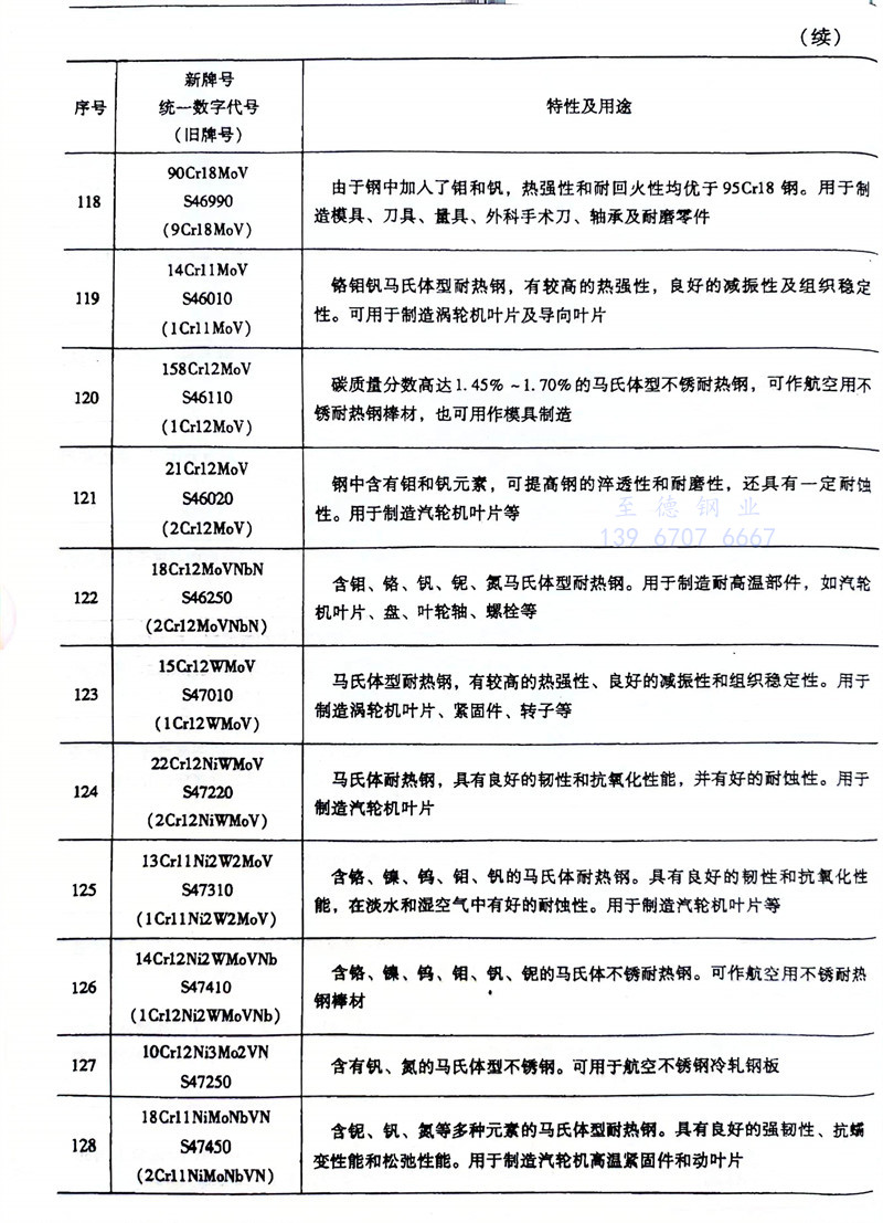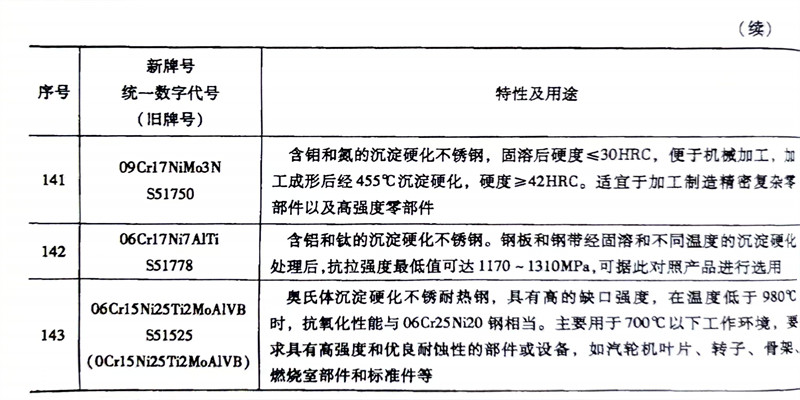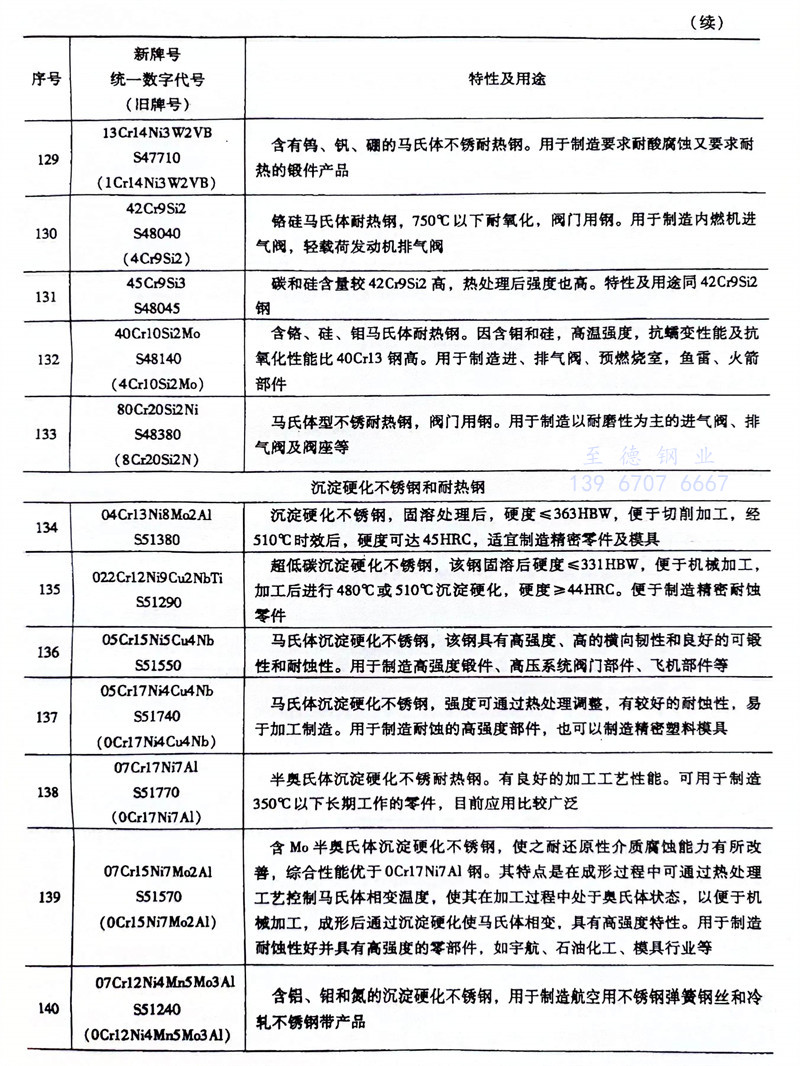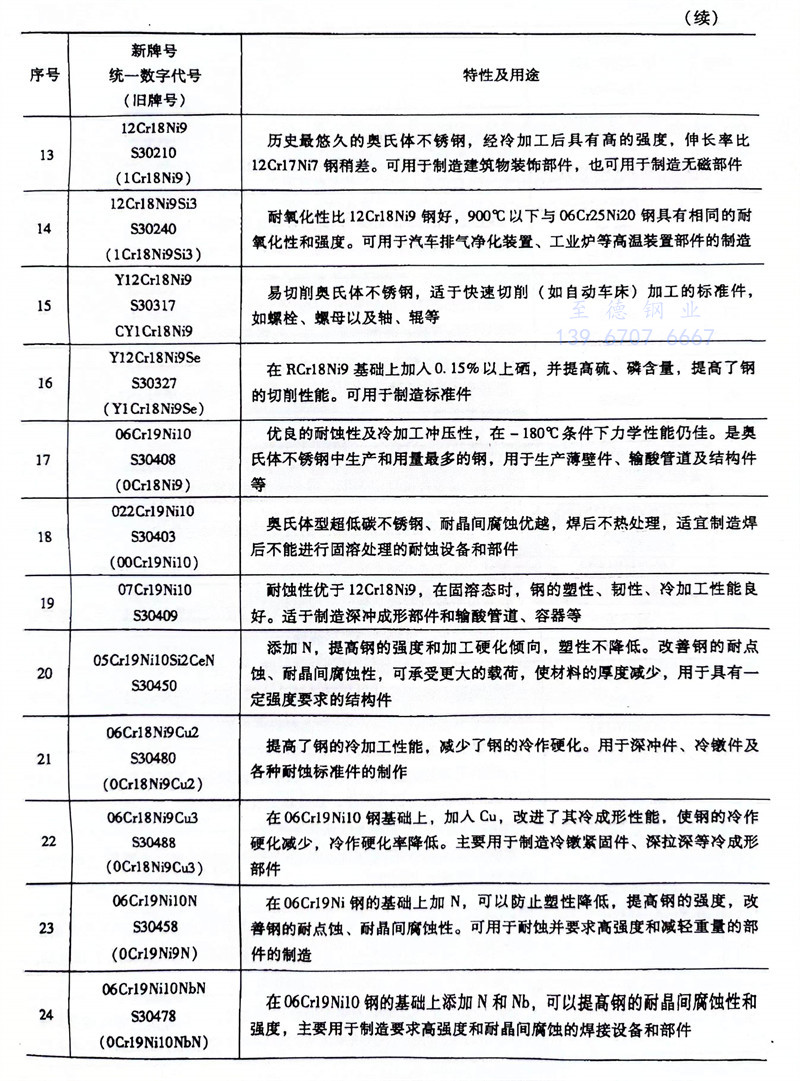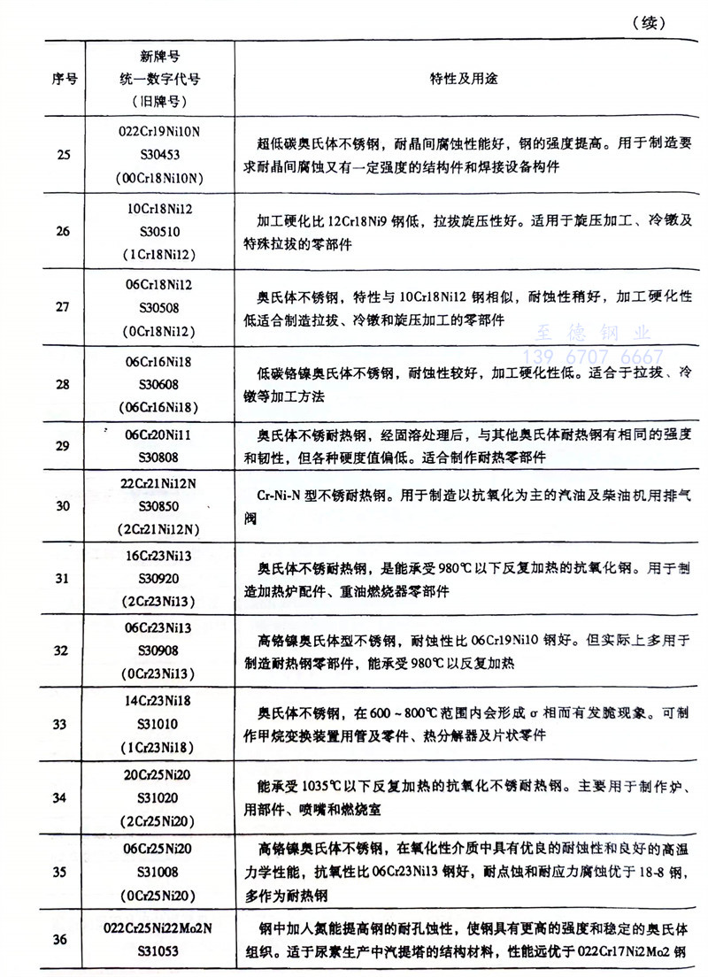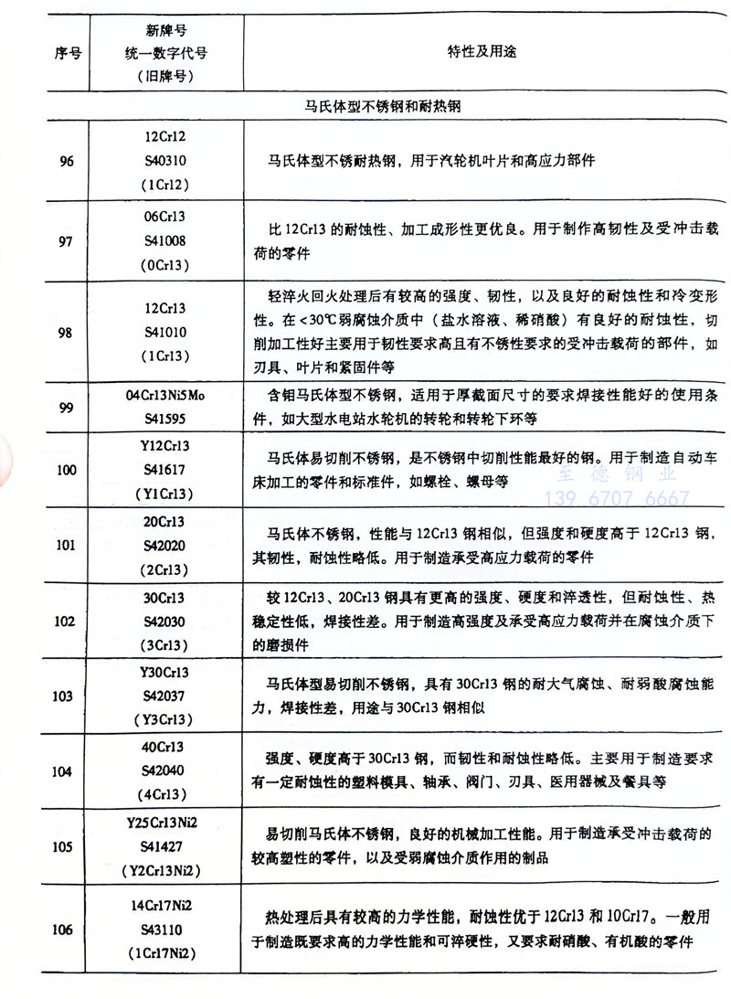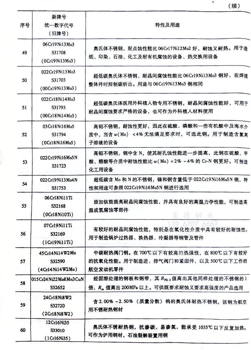 不銹鋼的選擇在大的方面可根據前面的方法選用。對于具體選擇哪一種不銹鋼,還應根據每一個不銹鋼鋼種的基本特性和相關因素來選擇適合生產需要、經濟上合理、技術上先進的不銹鋼。下面簡要介紹各類不銹鋼使用特性對比(見表2-7)、以及每種不銹鋼和耐熱鋼的特性和用途(見表2-8),供選擇時參考。