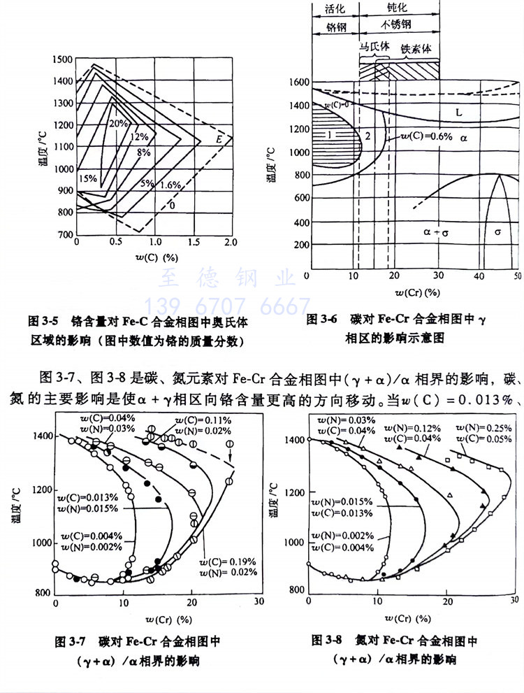 圖(tu)(tu)3-7、圖(tu)(tu)3-8是碳(tan)、氮元素(su)對Fe-Cr合金(jin)(jin)相(xiang)圖(tu)(tu)中(γ+α)/α相(xiang)界的影(ying)響,碳(tan)、氮的主要影(ying)響是使α+γ相(xiang)區向(xiang)鉻含(han)量(liang)更高的方(fang)向(xiang)移(yi)(yi)動。當(dang)w(C)=0.013%,w(N)=0.015%時(shi),Fe-Cr合金(jin)(jin)相(xiang)圖(tu)(tu)中α+γ雙相(xiang)區的位(wei)置從w(Cr)=13%移(yi)(yi)到了(Cr)=17%;而當(dang)w(C)=0.04%w(N)=0.03%時(shi),Fe-Cr合金(jin)(jin)相(xiang)圖(tu)(tu)中α+γ雙相(xiang)區則(ze)移(yi)(yi)到w(Cr)=21%;而當(dang)w(C)=0.19%w(N)=0.02%時(shi),則(ze)可(ke)移(yi)(yi)至w(Cr)=26%處。另外,碳(tan)和氮還使α+γ雙相(xiang)區最寬位(wei)置向(xiang)高的溫度方(fang)向(xiang)移(yi)(yi)動。