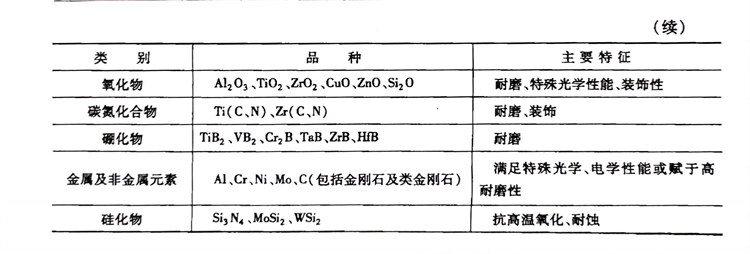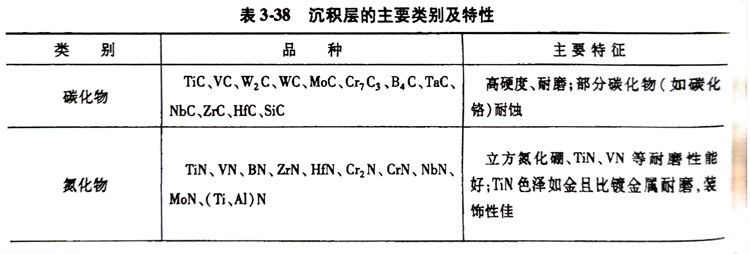 氣相(xiang)沉(chen)積按形(xing)(xing)成(cheng)的(de)基本原理(li),分為(wei)化學(xue)氣相(xiang)沉(chen)積(CVD)和物(wu)理(li)氣相(xiang)沉(chen)積(PVD)。氣相(xiang)沉(chen)積是在(zai)工件表面覆蓋一(yi)層(ceng)厚度為(wei)0.5~10μm的(de)過(guo)渡(du)族元(yuan)素(Ti、V、Cr、W、Nb等(deng))與C、N、O、B等(deng)形(xing)(xing)成(cheng)的(de)化合物(wu),或單一(yi)的(de)金屬及非(fei)金屬涂(tu)層(ceng),使零件表層(ceng)改(gai)變(bian)化學(xue)成(cheng)分,并在(zai)其(qi)表面形(xing)(xing)成(cheng)功能性(例(li)如超硬耐磨層(ceng))或裝飾性的(de)化合物(wu)涂(tu)層(ceng)的(de)新技術,現已廣泛應用于各類(lei)(lei)零件的(de)硬化處理(li)。沉(chen)積層(ceng)的(de)主(zhu)要(yao)類(lei)(lei)別(bie)及特性見表3-38。
