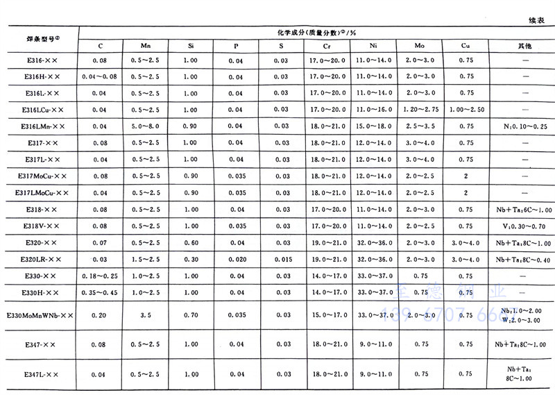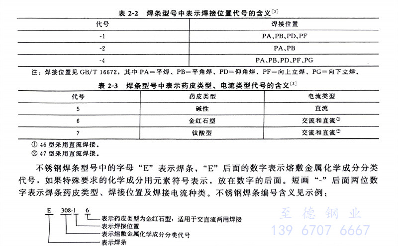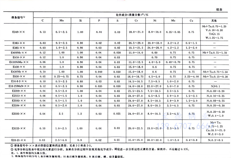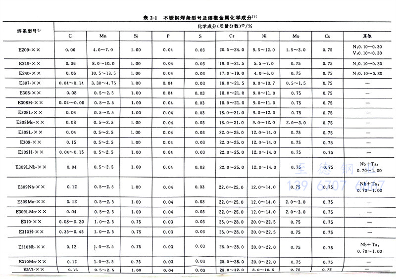 焊條型號是國家標準中對焊條規定的編號,GB/T 983-2012《不銹鋼焊條》根據焊條熔敷金屬的化學成分、焊接位置和藥皮類型、焊接電流種類規定了不銹(xiu)鋼(gang)焊條型號的編排方法(與美國焊接學會標準AWS A5.4M:2006《耐蝕鉻鋼及鉻鎳鋼焊條》焊條型號的編號方法類似)。不銹鋼(gang)焊條型號及熔敷金屬化學成分見表2-1,焊條型號中的焊接位置、藥皮類型和焊接電流種類的編號方法見表2-2、表2-3。不銹鋼焊條的技術要求、性能指標、檢驗方法應符合GB/T 983-2012《不銹鋼焊條》標準的規定。用于承壓特種設備的不銹鋼焊條還應符合NB/T 47018.2-2011(JB/T 4747)《承壓設備用焊接材料訂貨技術條件 第2部分:鋼焊條》的規定。