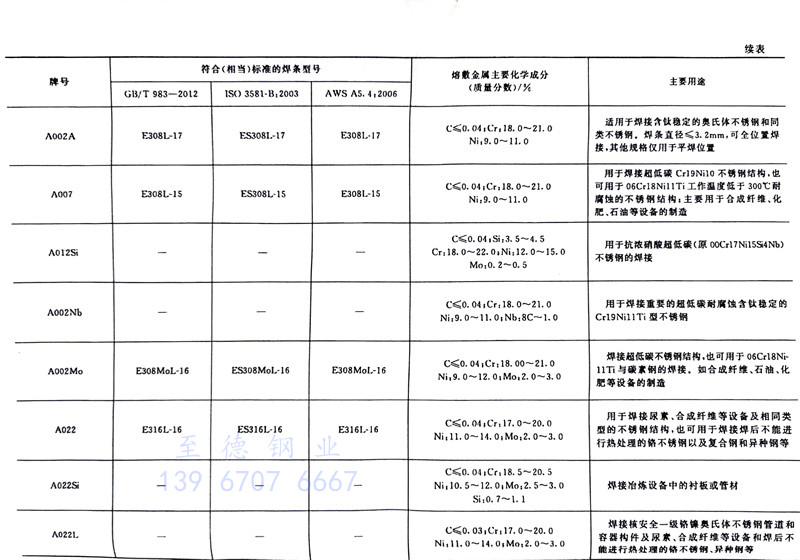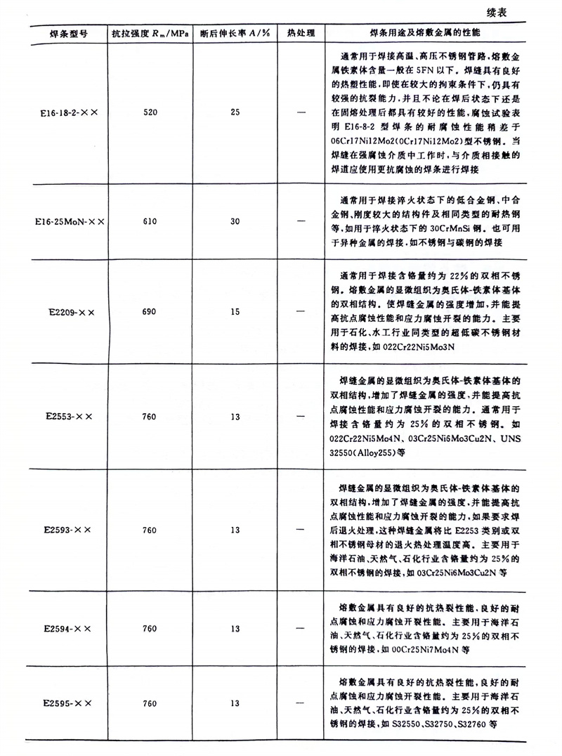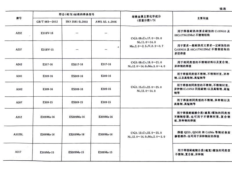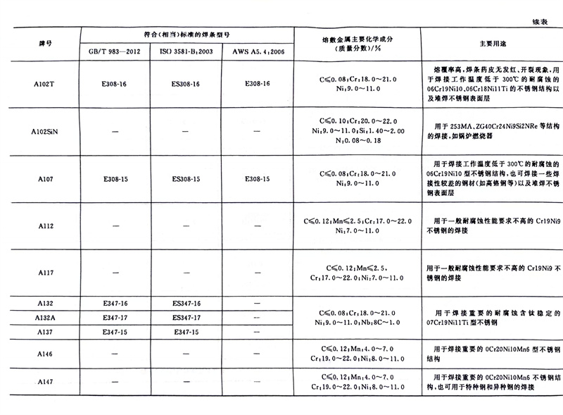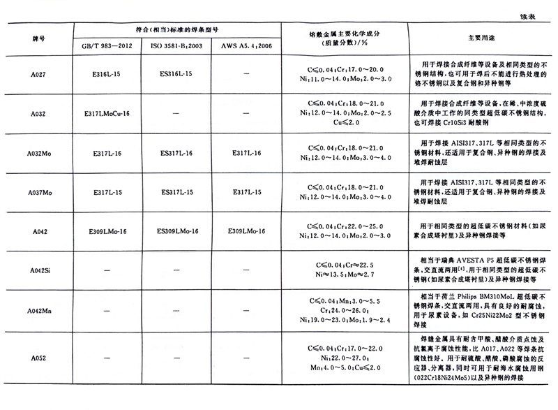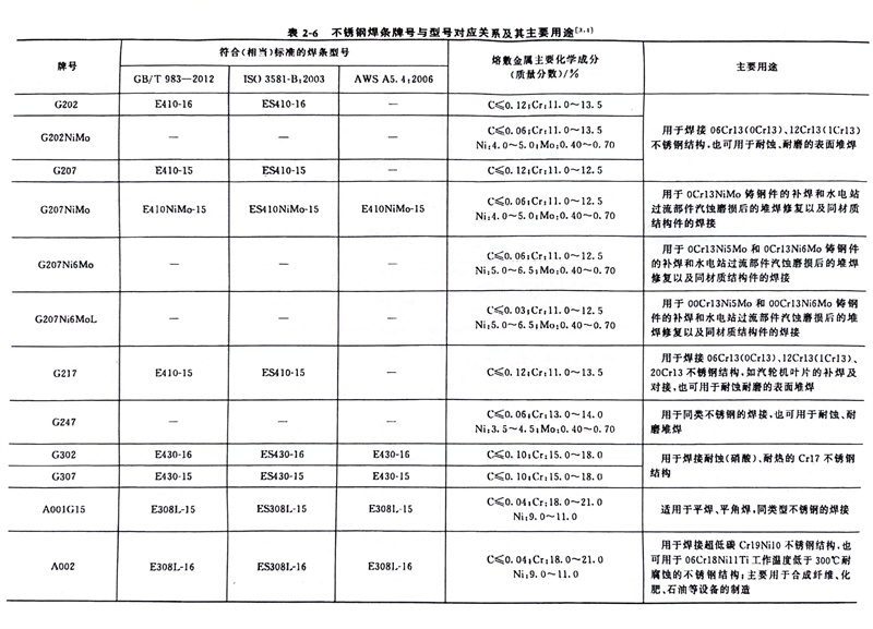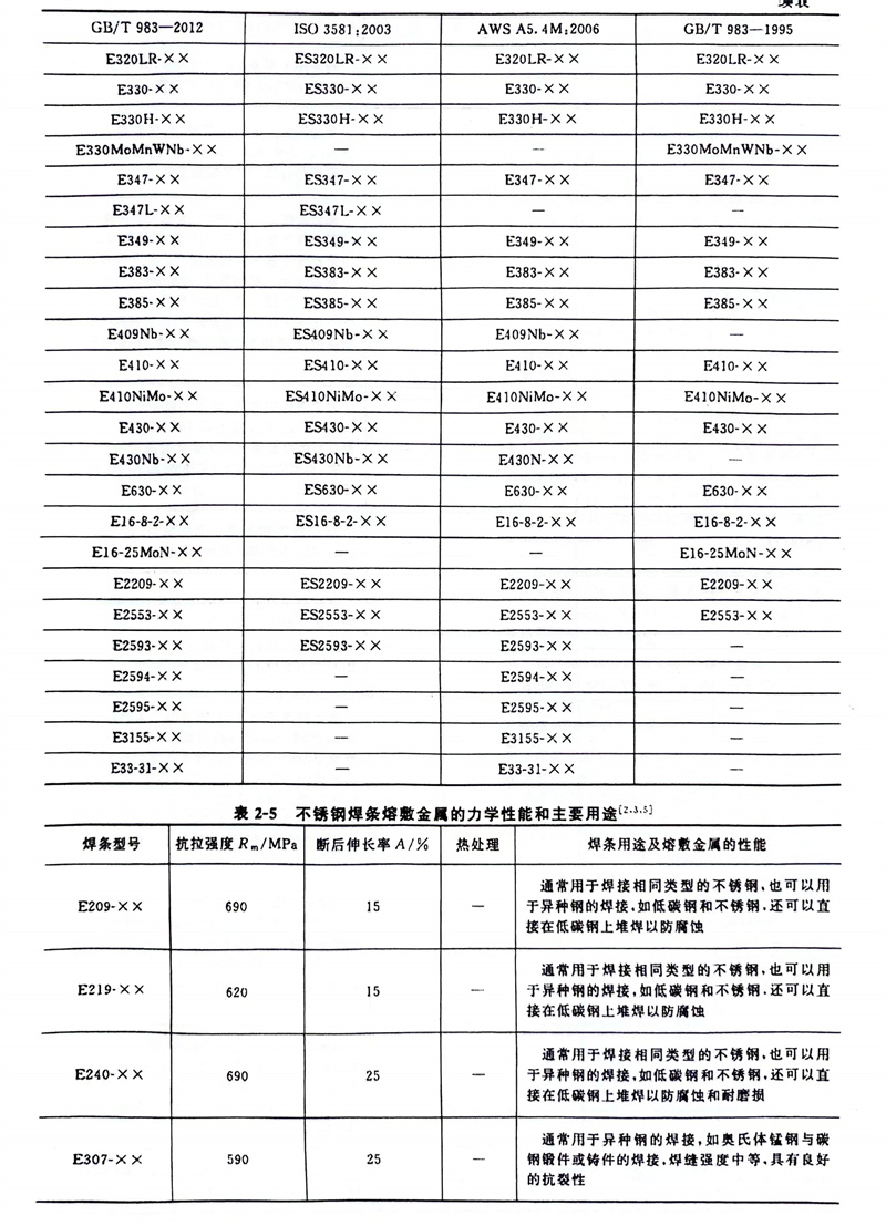 GB/T 983-2012《不銹(xiu)鋼焊條》與其(qi)他相關(guan)標(biao)準的(de)焊條型號之間的(de)對應關(guan)系見表(biao)2-4。不銹(xiu)鋼焊條熔敷(fu)金屬的(de)力學(xue)性能(neng)和主要用(yong)途(tu)見表(biao)2-5、表(biao)2-6。