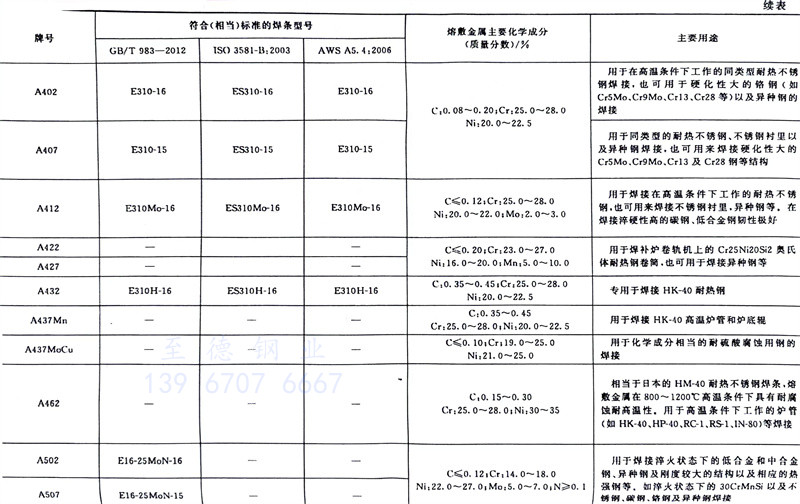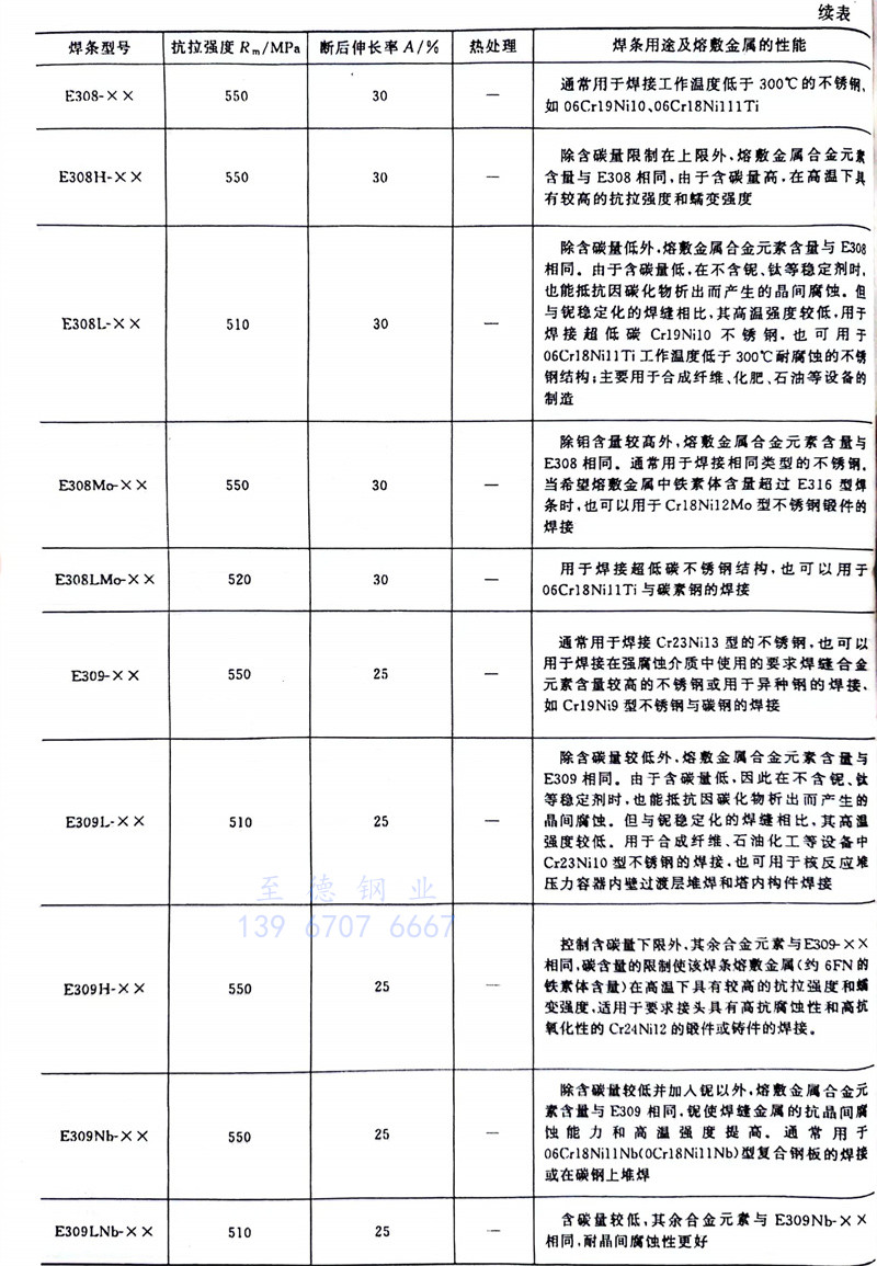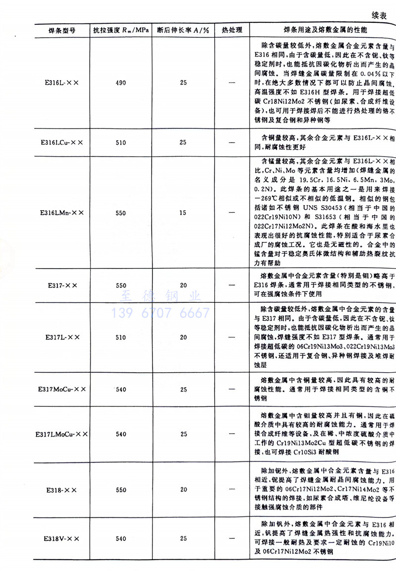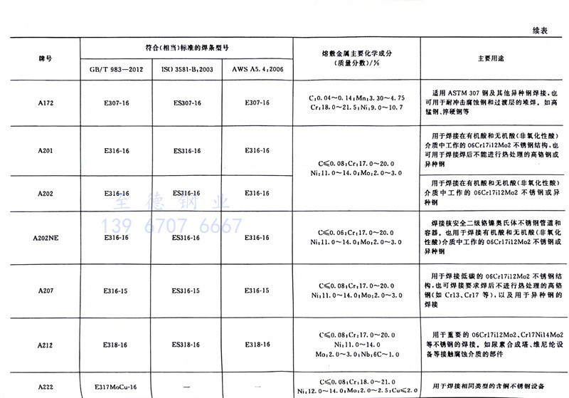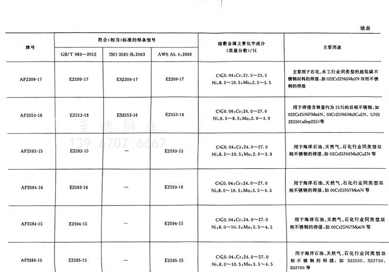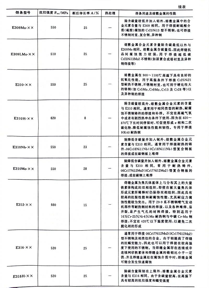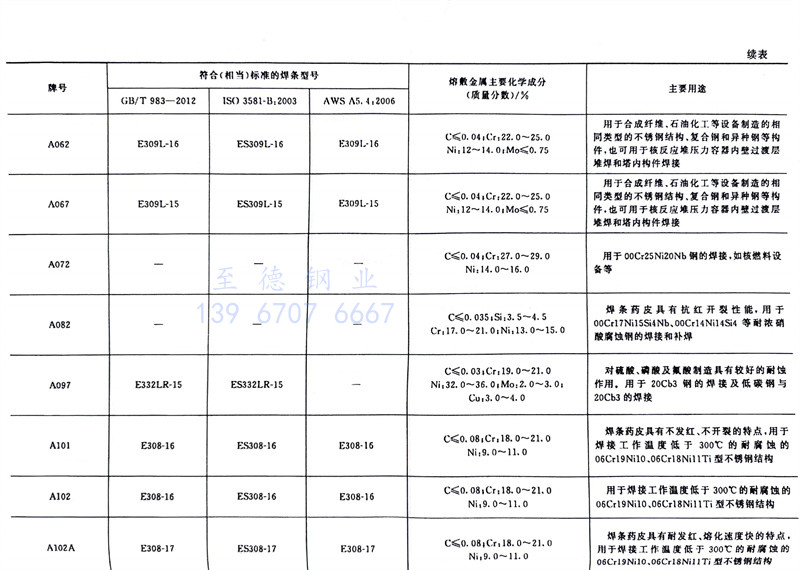 GB/T 983-2012《不銹(xiu)鋼焊條》與其(qi)他相關(guan)標(biao)準的(de)焊條型號之間的(de)對應關(guan)系見表(biao)2-4。不銹(xiu)鋼焊條熔敷(fu)金屬的(de)力學(xue)性能(neng)和主要用(yong)途(tu)見表(biao)2-5、表(biao)2-6。