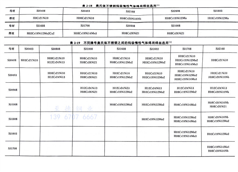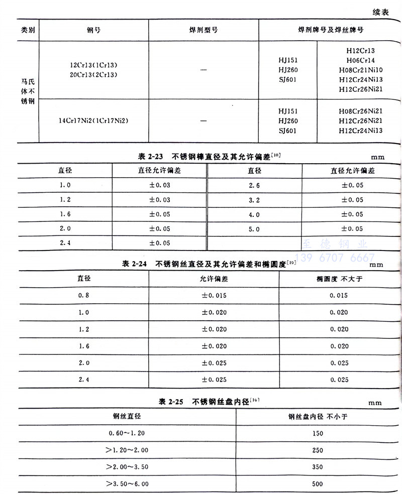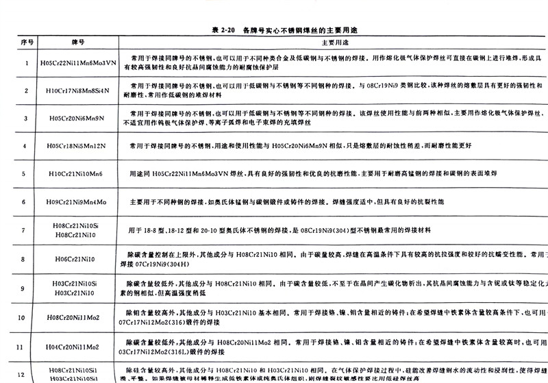 惰性氣體保護焊接時焊接區的金屬不會被氧化,所以焊絲熔化后化學成分基本不變,即焊縫金屬的化學成分就是焊絲的化學成分。焊接時要選擇與母材化學成分接近的焊絲,焊絲的化學成分見表2-17,不銹鋼壓力容器焊接用實心焊絲的選用見表2-18、表2-19。各牌號實心不銹鋼焊絲的主要用途見表2-20。非重要件焊接用焊絲可從不銹鋼母材截取板條作填充材料。對鋼棒直徑、鋼絲直徑和鋼絲盤內徑均有一定的要求,分別見表2-23~表2-25。其中鋼絲直徑和鋼絲盤內徑是氣體保護熔化極焊接方法提出的特殊要求。鋼棒長度為1000mm,允許正偏差≤50mm。鋼絲應規整,不得散亂或成“o”字形。