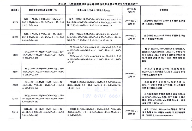 不銹鋼埋(mai)弧焊(han)用燒結焊(han)劑(ji)的牌號和主要(yao)化(hua)學成分及主要(yao)用途見表2-47。