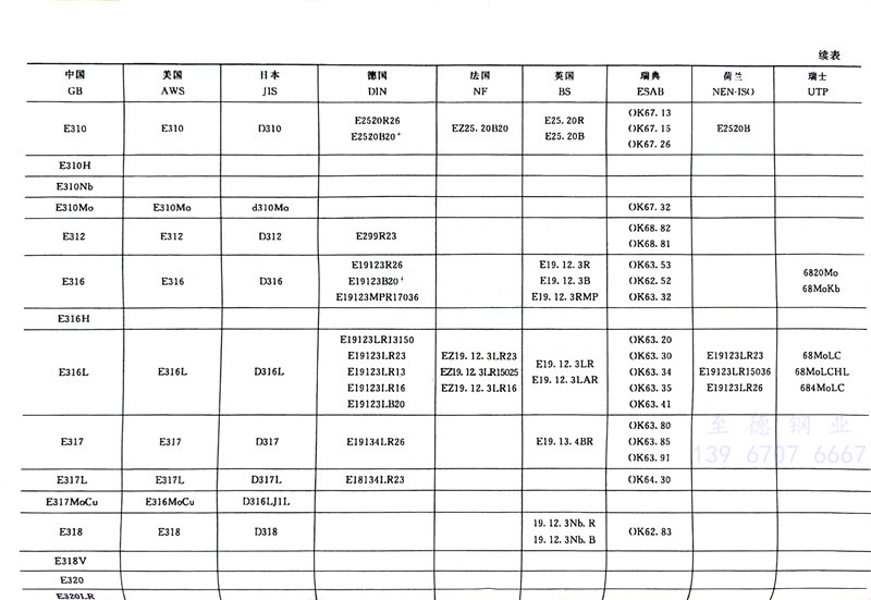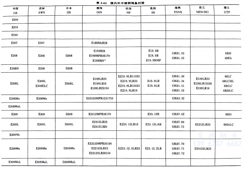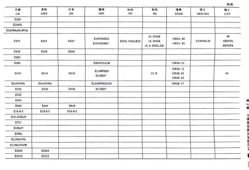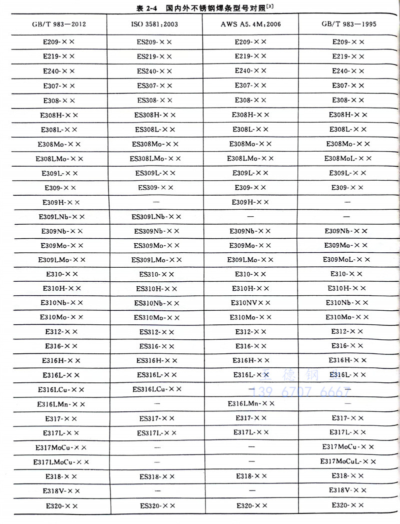 我國(guo)(guo)(guo)GB/T 983-2012《不(bu)(bu)銹(xiu)鋼焊(han)(han)(han)條(tiao)(tiao)》型號(hao)(hao)編(bian)排規則基本上(shang)采用美(mei)國(guo)(guo)(guo)AWS A5.4M:2006《耐蝕鉻鋼及鎳鋼焊(han)(han)(han)條(tiao)(tiao)》的(de)規定。我國(guo)(guo)(guo)不(bu)(bu)銹(xiu)鋼焊(han)(han)(han)條(tiao)(tiao)牌號(hao)(hao)、型號(hao)(hao)與美(mei)國(guo)(guo)(guo)AWS A5.4M標(biao)(biao)準(zhun)(zhun)的(de)對應關系見表2-4、表2-6、表2-62。日(ri)本工業標(biao)(biao)準(zhun)(zhun)JIS Z3221不(bu)(bu)銹(xiu)鋼焊(han)(han)(han)條(tiao)(tiao)標(biao)(biao)準(zhun)(zhun)直接采用美(mei)國(guo)(guo)(guo)AWS A5.4M標(biao)(biao)準(zhun)(zhun)焊(han)(han)(han)條(tiao)(tiao)類別號(hao)(hao),只是(shi)在焊(han)(han)(han)條(tiao)(tiao)型號(hao)(hao)的(de)三個數(shu)字前(qian)加“D”而不(bu)(bu)是(shi)“E”,例如JIS D308L-16,JIS D316-16等(deng),日(ri)本不(bu)(bu)銹(xiu)鋼焊(han)(han)(han)條(tiao)(tiao)與中國(guo)(guo)(guo)不(bu)(bu)銹(xiu)鋼焊(han)(han)(han)條(tiao)(tiao)對應關系見表2-62。韓國(guo)(guo)(guo)的(de)KS標(biao)(biao)準(zhun)(zhun)也采用AWS類別號(hao)(hao),只是(shi)在焊(han)(han)(han)條(tiao)(tiao)型號(hao)(hao)的(de)三個數(shu)字前(qian)加“D”而不(bu)(bu)是(shi)“E”,例如 KS D308L-16,KS D316-16等(deng)。