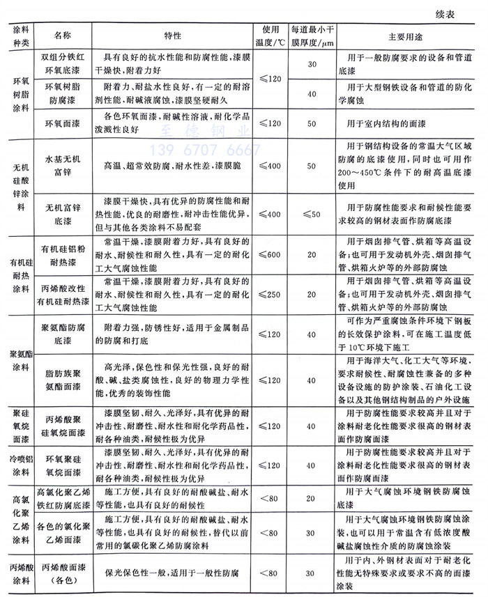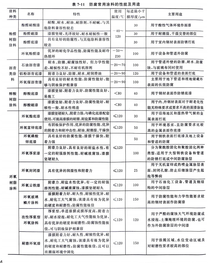 壓力管道防腐常(chang)用(yong)涂料的(de)性能及(ji)用(yong)途見表 7-11