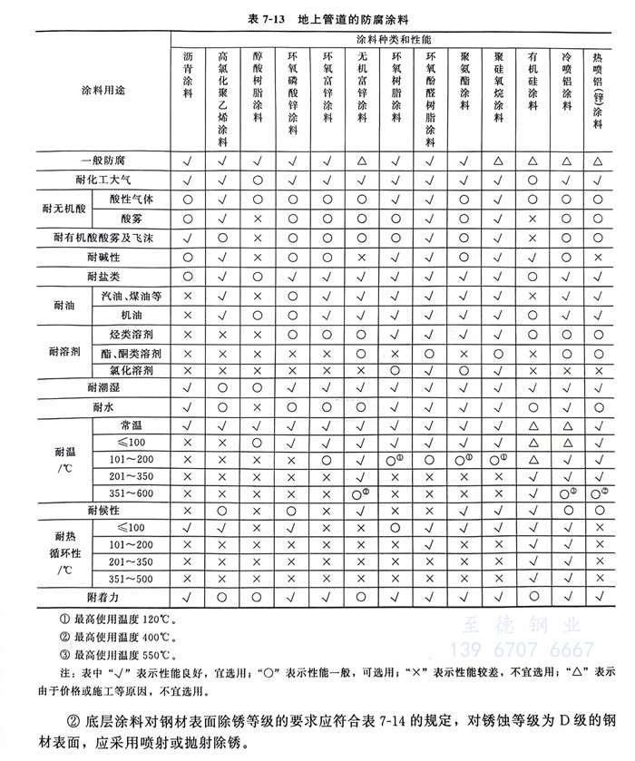 SH/T3022標準地上管道的防腐涂料(liao)(liao)見(jian)表(biao)(biao) 7-13,底層涂料(liao)(liao)對(dui)鋼材表(biao)(biao)面(mian)(mian)除銹(xiu)等級(ji)的要求應(ying)符合表(biao)(biao)7-14的規定,對(dui)銹(xiu)蝕(shi)等級(ji)為D級(ji)的鋼材表(biao)(biao)面(mian)(mian),應(ying)采(cai)用噴射(she)或(huo)拋射(she)除銹(xiu)。