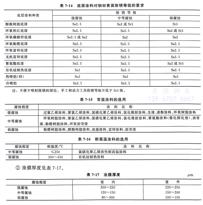 HG/T 20679 標準地上管道防腐要求:按腐蝕程度選擇涂料的品種(表7-15、表7-16),涂膜厚度見表7-17。